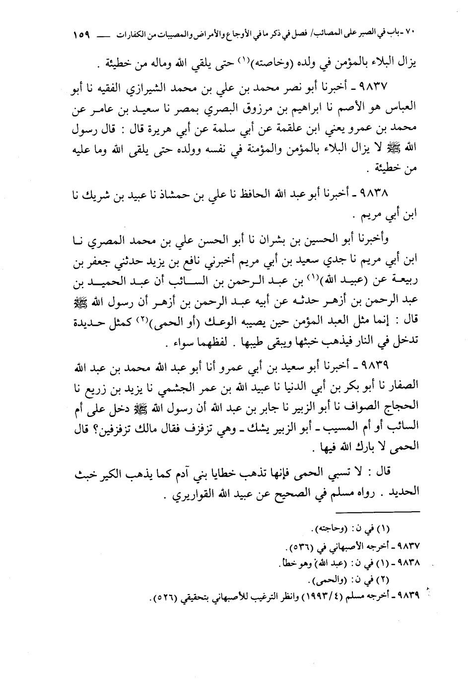 9839 - أخبرنا أبو سعيد بن أبي عمرو أنا أبو عبد الله محمد بن عبد الله الصفار نا أبو بكر بن أبي الدنيا نا عبيد الله بن عمر الجشمي نا يزيد بن زريع نا الحجاج الصواف نا أبو الزبير نا جابر بن عبد الله : أن رسول الله صلى الله عليه و سلم دخل على أم السائب أو أم المسيب ـ أبو الزبير يشك ـ و هي تزفزف فقال مالك تزفرين ؟ قال : الحمى لا بارك الله فيها