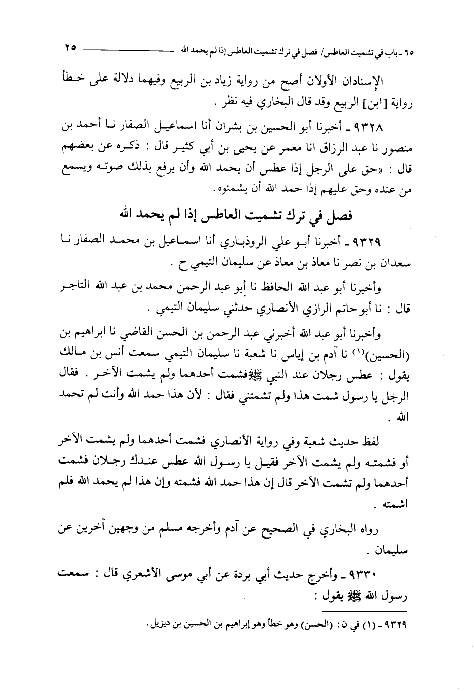 9330 - و أخرج حديث أبي بردة عن أبي موسى الأشعري قال : سمعت رسول الله صلى الله عليه و سلم يقول : إذا عطس أحدكم فحمد الله فشمتوه و إذا لم يحمد الله فلا تشمتوه