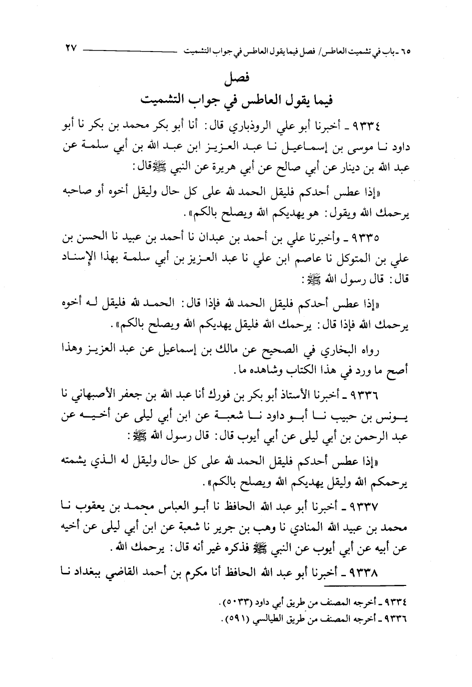 9334 - أخبرنا أبو علي الروذباري قال : أنا أبو بكر محمد بن بكر نا أبو داود نا موسى بن إسماعيل نا عبد العزيز ابن عبد الله بن أبي سلمة عن عبد الله بن دينار عن أبي صالح عن أبي هريرة : عن النبي قال : إذا عطس أحدكم فليقل الحمد لله على كل حال و ليقل أخوه أو صاحبه يرحمك الله و يقول : هو يهديكم الله و يصلح بالكم