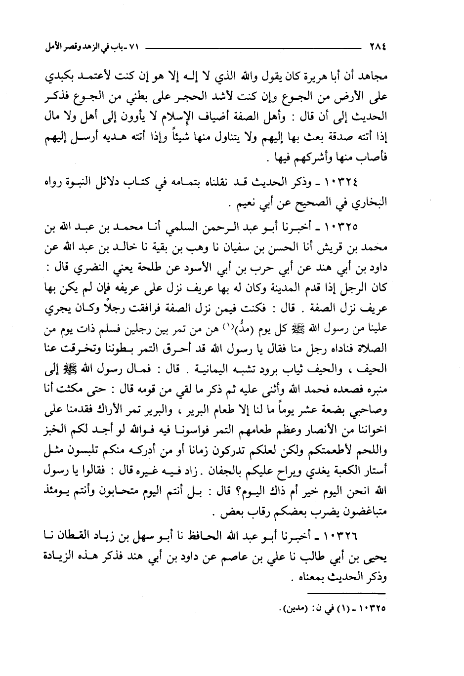 10325 - أخبرنا أبو عبد الرحمن السلمي أنا محمد بن عبد الله بن محمد بن قريش أنا الحسن بن سفيان نا وهب بن بقية نا خالد بن عبد الله عن داود بن أبي هند عن أبي حرب بن أبي الأسود عن طلحة يعني النضري قال : كان الرجل إذا قدم المدينة و كان له بها عريف نزل على عريفه فإن لم يكن بها عريف نزل الصفة قال : فكنت فيمن نزل الصفة فرافقت رجلا و كان يجري علينا رسول الله صلى الله عليه و سلم كل يوم مد هن من تمر بين رجلين فسلم ذات يوم من الصلاة فناداه رجل منا فقال يا رسول الله قد أحرق التمر بطوننا و تخرقت عنا الحيف و الحيف ثياب برود تشبه اليمانية قال : فمال رسول الله صلى الله عليه و سلم إلى منبره فصعده فحمد الله و أثنى عليه ثم ذكر ما لقي من قومه قال : حتى مكثت أنا و صاحبي بضعة عشر يوما ما لنا إلا طعام البرير و البرير تمر الأراك فقدمنا على إخواننا من الأنصار و عظم طعامهم التمر فواسونا فيه فوالله لو أجد لكم الخبز و اللحم لأطعمتكم و لكن لعلكم تدركون زمانا أو من أدركه منكم تلبسون مثل أستار الكعبة يغدي و يراح عليكم بالجفان زاد فيه غيره قال : فقالوا يا رسول الله أنحن اليوم خير أم ذاك اليوم ؟ قال : بل أنتم اليوم متحابون و أنتم يومئذ متباغضون يضرب بعضكم رقاب بعض