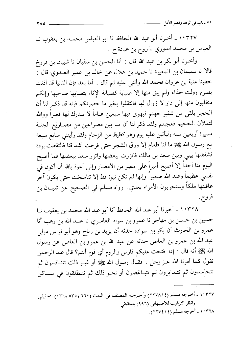 10328 - أخبرنا أبو عبد الله الحافظ أنا أبو عبد الله محمد بن يعقوب نا حسين بن حسن بن مهاجر نا عمرو بن سواد العامري نا عبد الله بن وهب أنا عمرو بن الحارث أن بكر بن سواده حدثه أن يزيد بن رباح و هو أبو فراس مولى عبد الله بن عمرو بن العاص حدثه عن عبد الله بن عمرو بن العاص : عن رسول الله صلى الله عليه و سلم أنه قال : إذا فتحت عليكم فارس و الروم أي قوم أنتم ؟ قال عبد الرحمن نقول كما أمرنا الله عز و جل فقال رسول الله صلى الله عليه و سلم أو غير ذلك تتنافسون ثم تتحاسدون ثم تتدابرون ثم تتباغضون أو نحو ذلك ثم تنطلقون في مساكن المهاجرين فتجعلون بعضهم على رقاب بعض رواه مسلم في الصحيح عن عمرو بن سواد