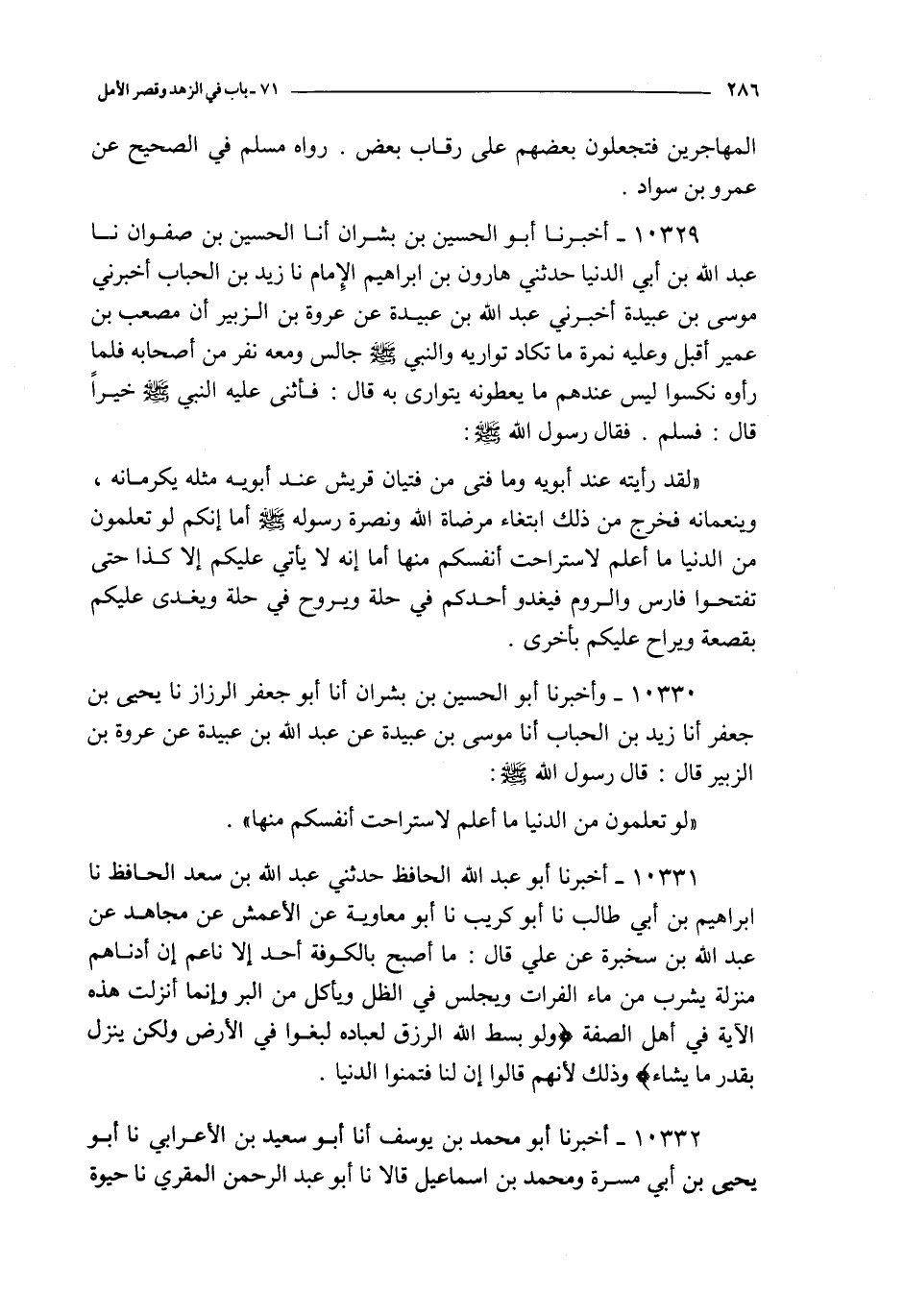 10330 - و أخبرنا أبو الحسين بن بشران انا أبو جعفر الرزاز نا يحيى بن جعفر أنا زيد بن الحباب أنا موسى بن عبيدة عن عبد الله بن عبيدة عن عروة بن الزبير قال : قال رسول الله صلى الله عليه و سلم : لو تعلمون من الدنيا ما اعلم لاستراحت أنفسكم منها