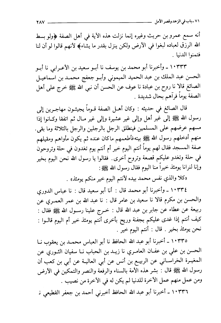 10333 - و أخبرنا أبو محمد بن يوسف نا أبو سعيد بن الأعرابي نا أبو الحسن عبد الملك بن عبد الحميد الميموني و أبو جعفج محمد بن إسماعيل الصائغ قالا نا روح بن عبادة نا عوف عن الحسن : أن نبي الله صلى الله عليه و سلم خرج على أهل الصفة يوما فرآهم بحال شديدة