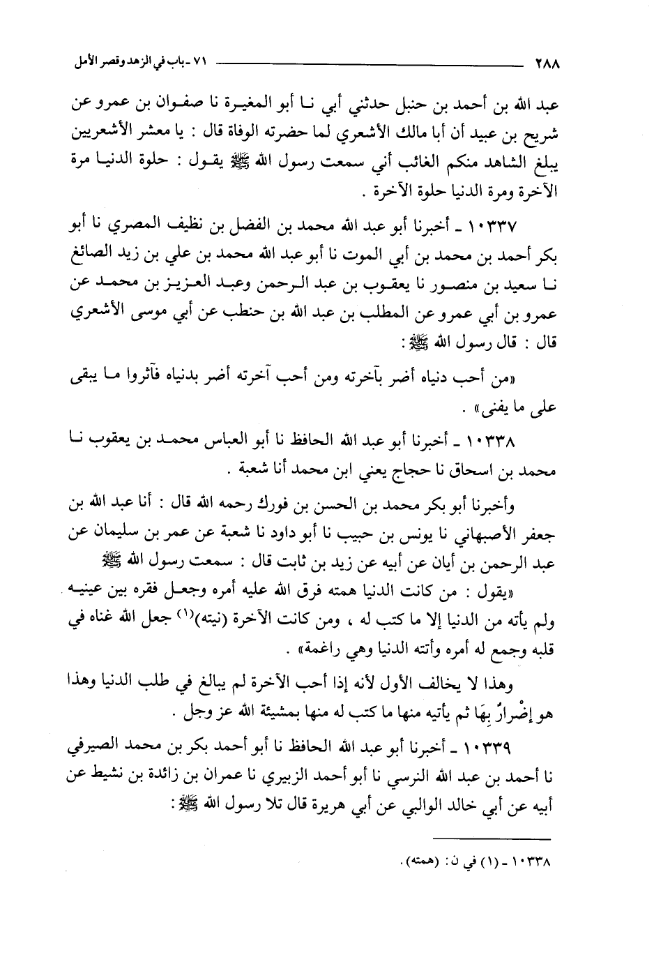 و أخبرنا أبو بكر محمد بن الحسن بن فورك رحمه الله قال : أنا عبد الله بن جعفر الأصبهاني نا يونس بن حبيب نا أبو داود نا شعبة عن عمر بن سليمان عن عبد الرحمن بن أيان عن أبيه عن زيد بن ثابت قال : سمعت رسول الله صلى الله عليه و سلم يقول : من كانت الدنيا همته فرق الله عليه أمره و جعل فقره بين عينيه و لم يأته من الدنيا إلا ما كتب له و من كانت الآخرة نيته جعل الله غناه في قلبه و جمع له أمره و أتته الدنيا و هي راغمة