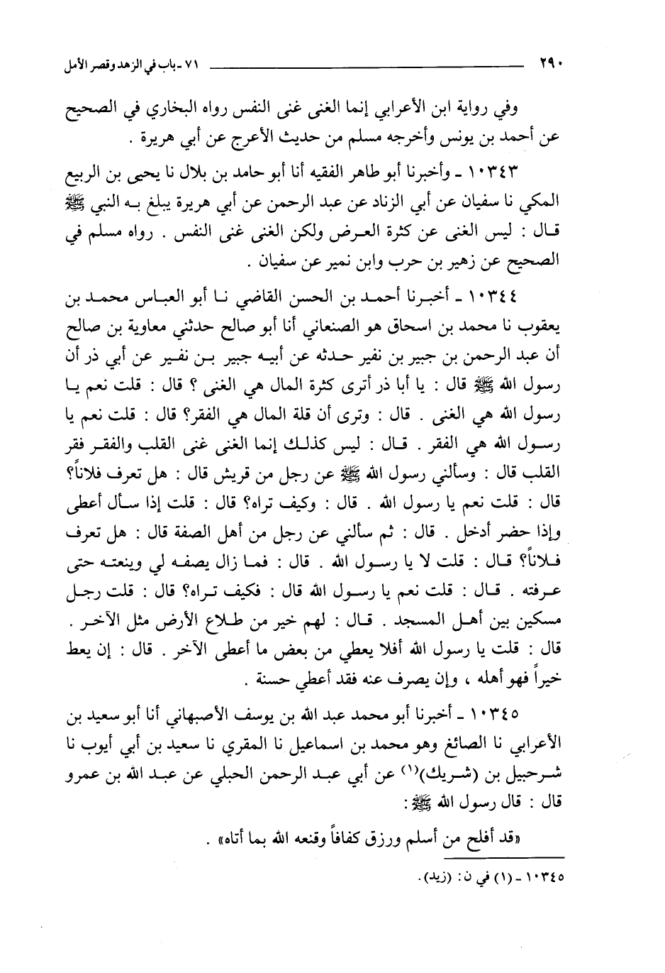 10343 - و أخبرنا أبو طاهر الفقيه أنا أبو حامد بن بلال نا يحيى بن الربيع المكي نا سفيان عن أبي الزناد عن عبد الرحمن عن أبي هريرة : يبلغ به النبي صلى الله عليه و سلم قال : ليس الغنى عن كثرة العرض و لكن الغنى غنى النفس