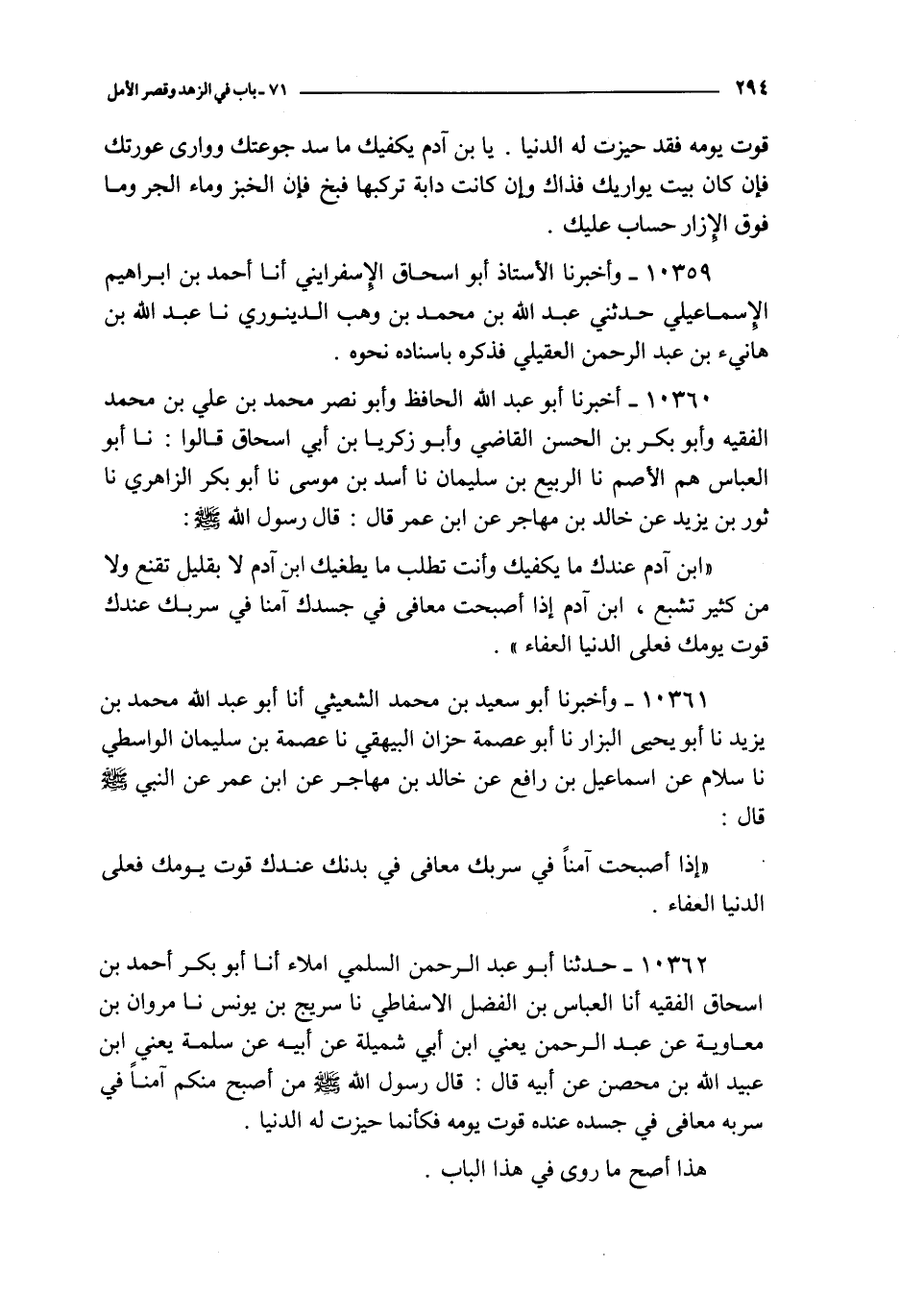 10360 - أخبرنا أبو عبد الله الحافظ و أبو نصر محمد بن علي بن محمد الفقيه و أبو بكر بن الحسن القاضي و أبو زكريا بن أبي إسحاق قالوا : نا أبو العباس هم الأصم نا الربيع بن سليمان نا أسد بن موسى نا أبو بكر الزاهري نا ثور بن يزيد عن خالد بن مهاجر عن ابن عمر قال : قال رسول الله صلى الله عليه و سلم : ابن آدم عندك ما يكفيك و أنت تطلب ما يطغيك ابن آدم لا بقليل تقنع و لا من كثير تشبع ابن آدم إذا أصبحت معافى في جسدك آمنا في سربك عندك قوت يومك فعلى الدنيا العفاء