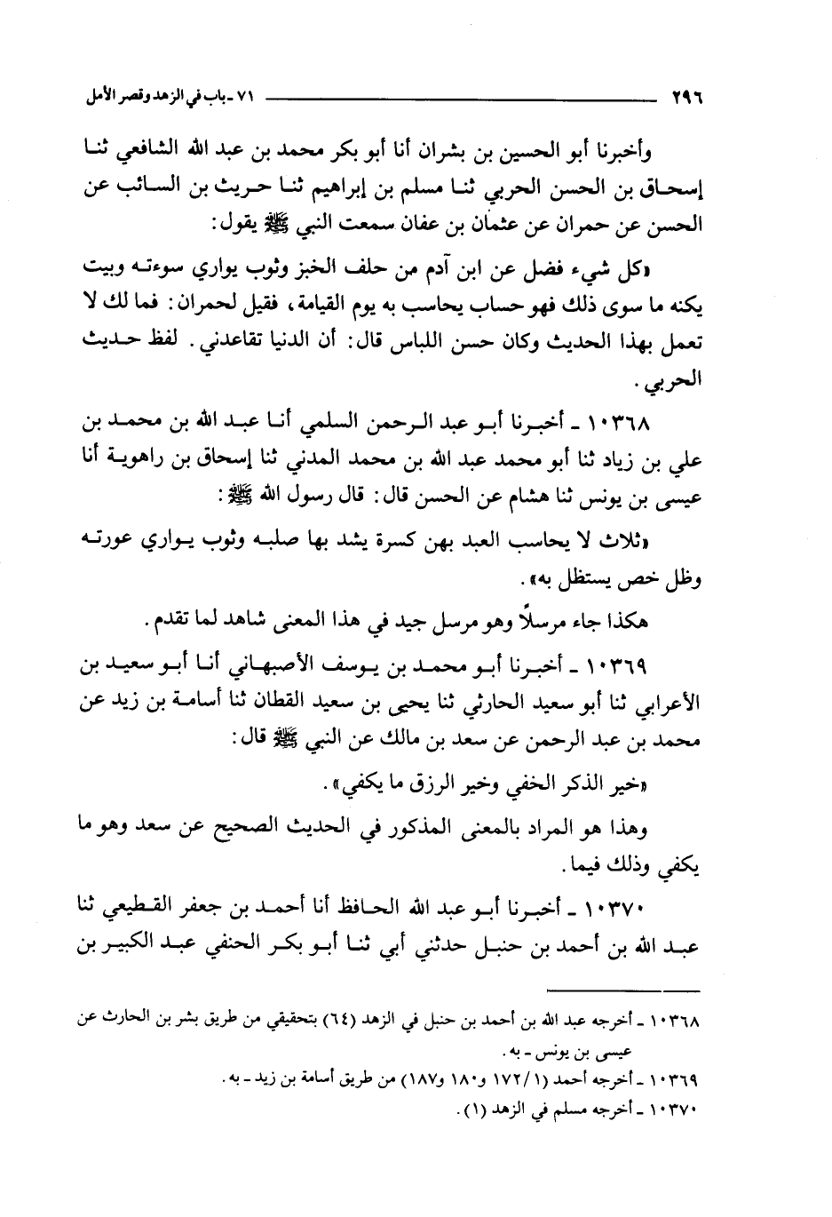 10368 - أخبرنا أبو عبد الرحمن السلمي أنا عبد الله بن محمد بن علي بن زياد نا أبو محمد عبد الله بن محمد المدني نا إسحاق بن راهوية أنا عيسى بن يونس نا هشام عن الحسن قال : قال رسول الله صلى الله عليه و سلم : ثلاث لا يحاسب العبد بهن كسرة يشد بها صلبه و ثوب يواري عورته و ظل خص يستظل به