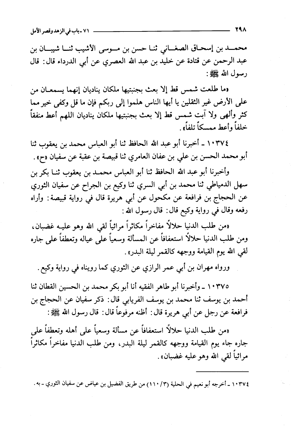و أخبرنا أبو عبد الله الحافظ نا أبو العباس محمد بن يعقوب نا بكر بن سهل الدمياطي نا محمد بن أبي السري نا وكيع بن الجراح عن سفيان الثوري عن الحجاج بن فرافعة عن مكحول عن أبي هريرة قال في رواية قبيصة : و أراه رفعه و قال في رواية وكيع قال : قال رسول الله : من طلب الدنيا حلالا مفاخرا مكاثرا مرائيا لقي الله و هو عليه غضبان و من طلب الدنيا حلالا استعفافا عن المسلألة و سعيا على عياله و تعطفا على جاره لقي الله يوم القيامة و وجهه كالقمر ليلة البدر