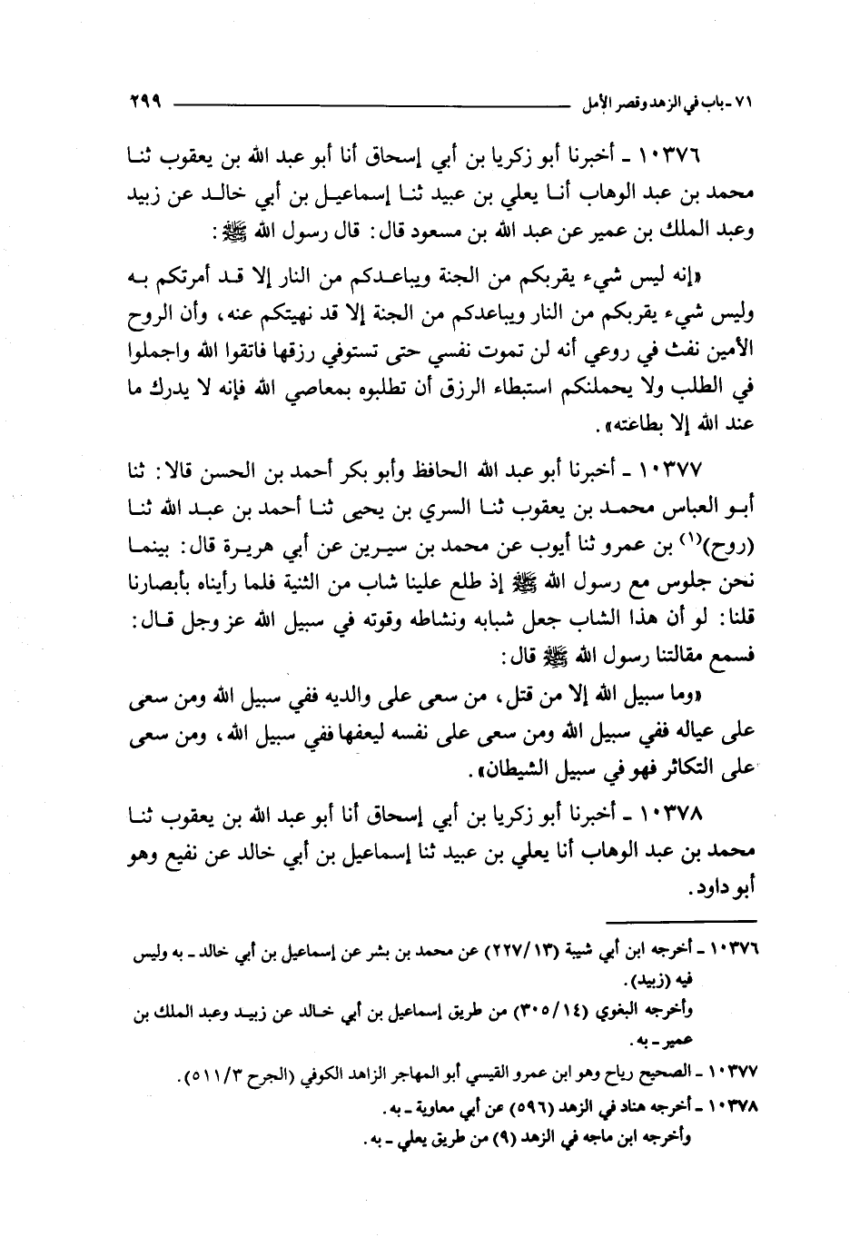 10377 - أخبرنا أبو عبد الله الحافظ و أبو بكر أحمد بن الحسن قالا : نا أبو العباس محمد بن يعقوب نا السري بن يحيى نا أحمد بن عبد الله نا روح بن عمرو نا أيوب عن محمد بن سيرين عن أبي هريرة قال : بينما نحن جلوس مع رسول الله صلى الله عليه و سلم إذ طلع علينا شاب من الثنية فلما رأيناه بأبصارنا قلنا : لو أن هذا الشاب جعل شبابه و نشاطه و قوته في سبيل الله عز و جل قال : فسمع مقالتنا رسول الله صلى الله عليه و سلم قال :