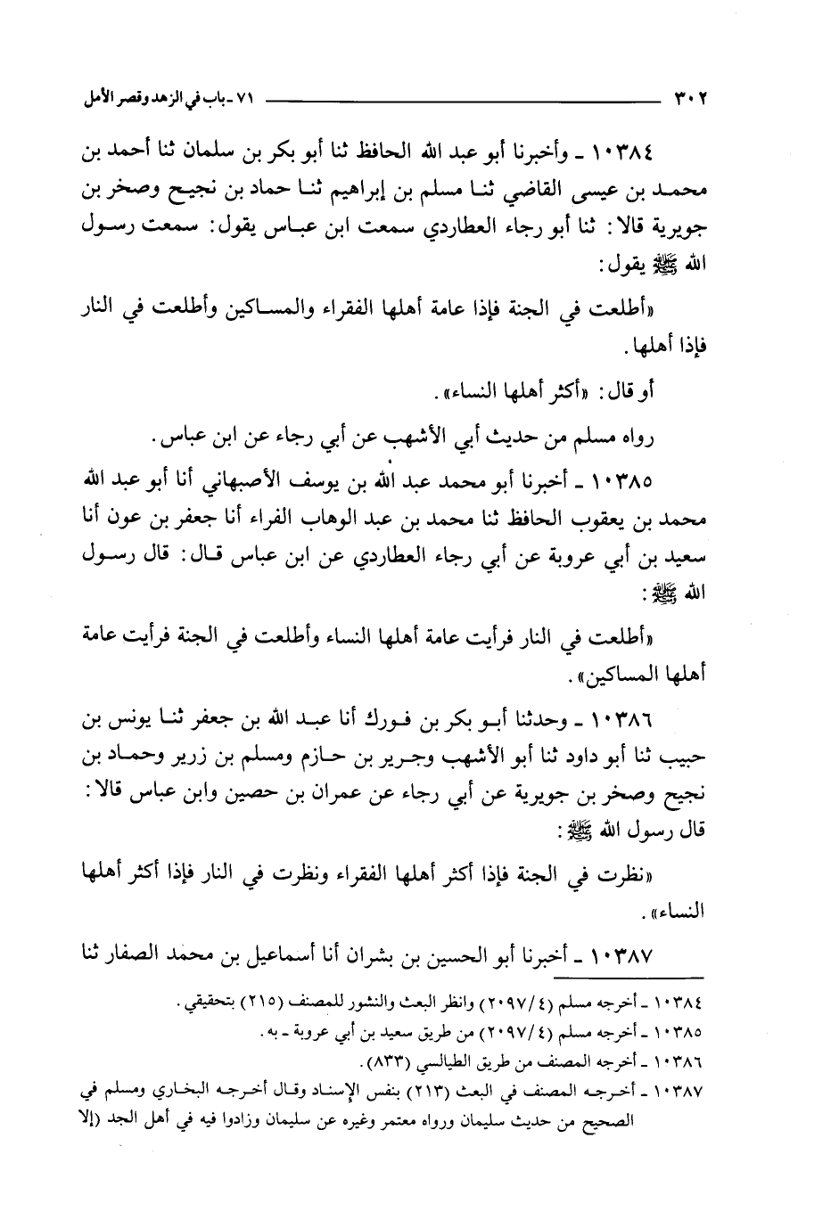 10387 - أخبرنا أبو الحسين بن بشران أنا إسماعيل بن محمد الصفار ثنا محمد بن عبد الملك الدقيقي ثنا يزيد بن هارون أنا سليمان التيمي عن أبي عثمان عن أسامة بن زيد قال : قال رسول الله صلى الله عليه و سلم : قمت على باب الجنة فإذا أكثر من يدخلها الفقراء و إذا أصحاب الجد محبوسون و قمت على باب النار فإذا أكثر من يدخلها النساء