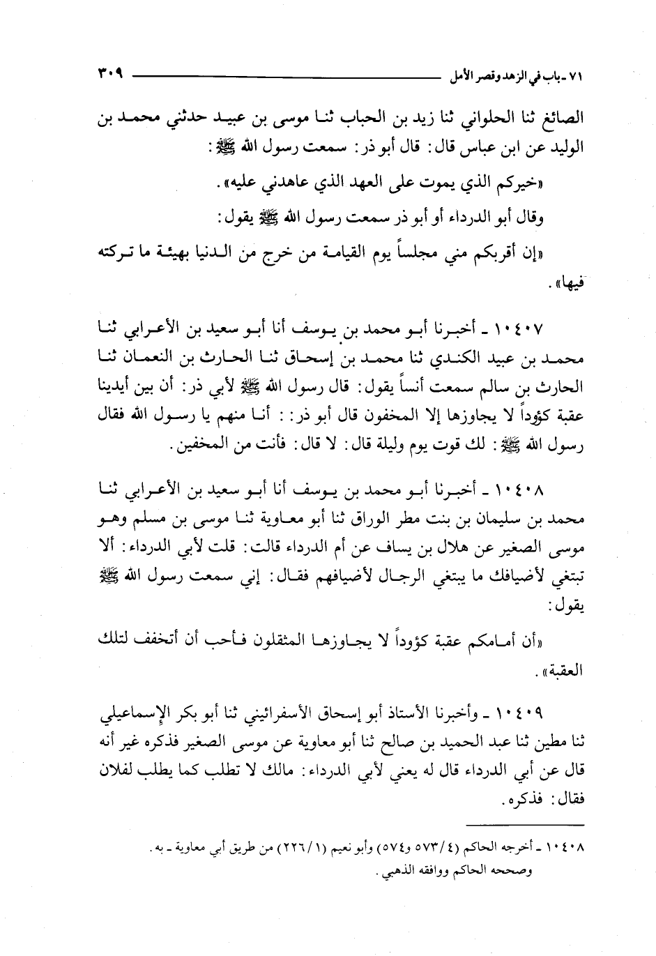 10409 - و أخبرنا الأستاذ أبو إسحاق الأسفريني ثنا أبو بكر الإسماعيلي ثنا مطين ثنا عبد الحميد بن صالح ثنا أبو معاوية عن موسى الصغير : فذكره غير أنه قال عن أبي الدرداء قال له يعني لأبي الدرداء : مالك لا تطلب كما يطلب لفلان فقال : فذكره