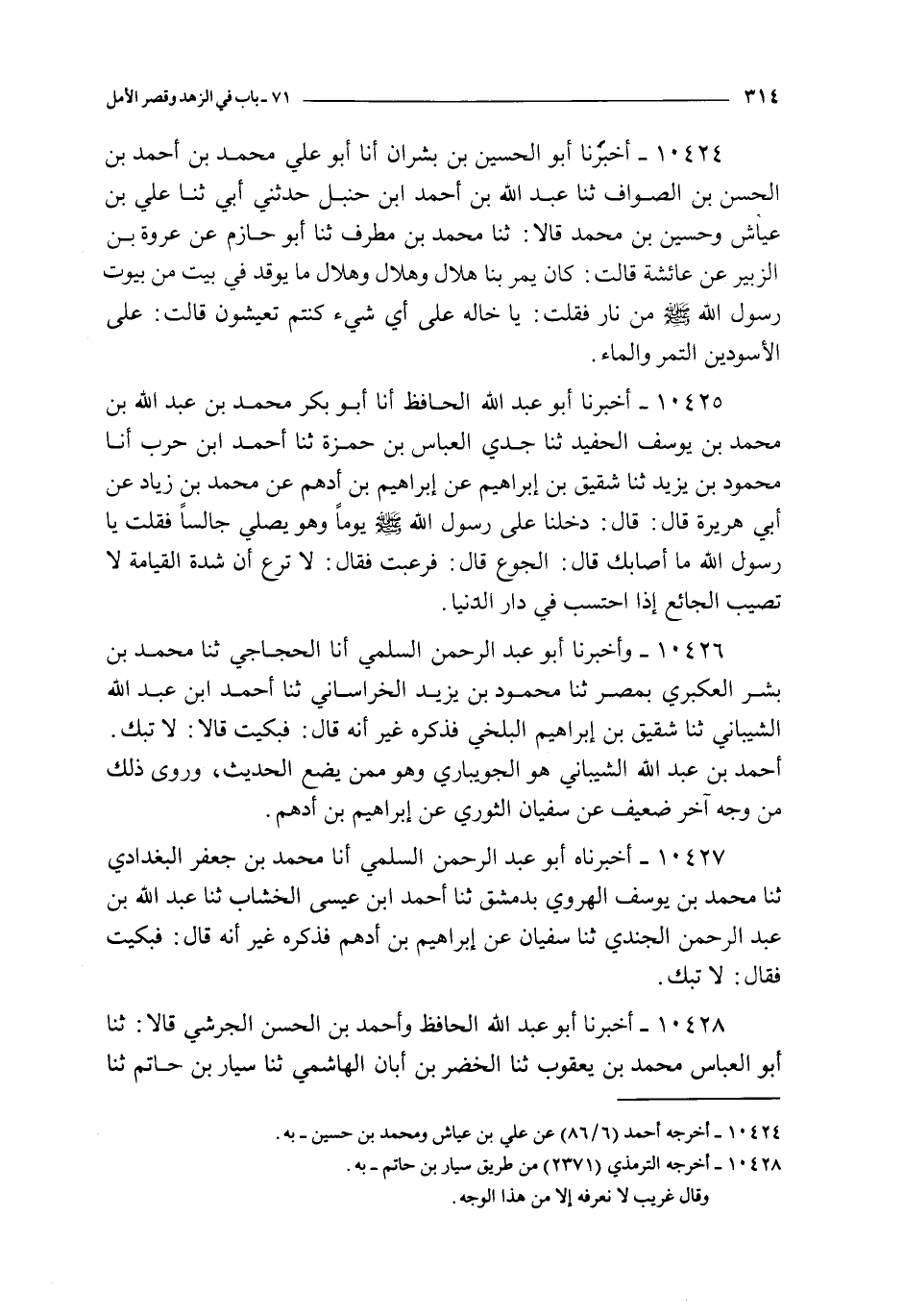 10425 - أخبرنا أبو عبد الله الحافظ أنا أبو بكر محمد بن عبد الله بن محمد بن يوسف الحفيد ثنا جدي العباس بن حمزة ثنا أحمد بن حرب أنا محمود بن يزيد ثنا شقيق بن إبراهيم عن إبراهيم بن أدهم عن محمد بن زياد عن أبي هريرة قال : دخلنا على رسول الله صلى الله عليه و سلم يوما و هو يصلي جالسا فقلت يا رسول الله ما أصابك قال : الجوع قال : فرعبت فقال : لا ترع أن شدة القيامة لا تصيب الجائع إذا احتسب في دار الدنيا