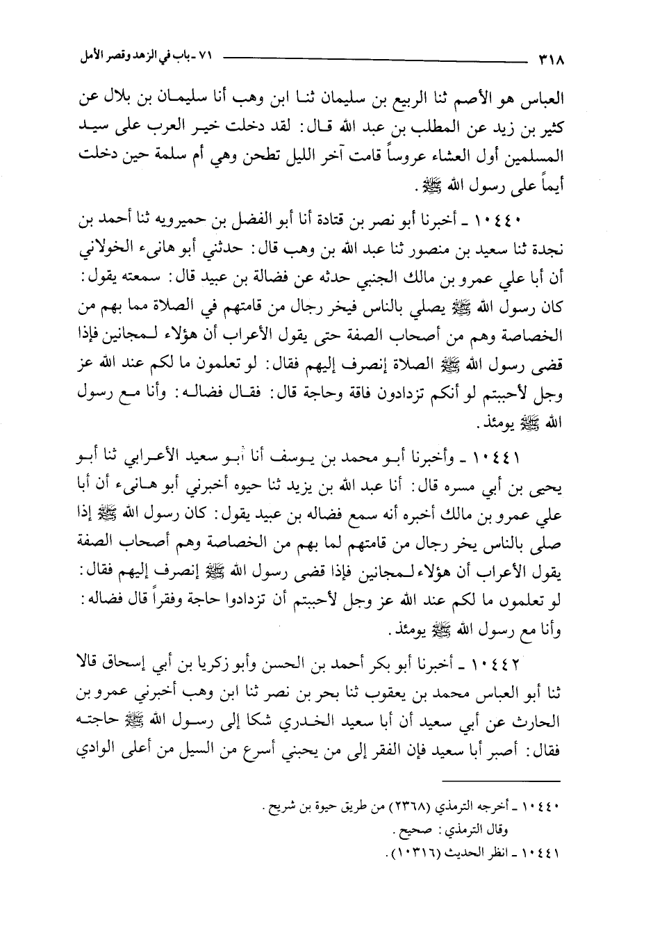 10441 - و أخبرنا أبو محمد بن يوسف أنا أبو سعيد الأعرابي ثنا أبو يحيى بن أبي مسرة قال : أنا عبد الله بن يزيد ثنا حيوة أخبرني أبو هانىء أن أبا علي عمرو بن مالك أخبره أنه سمع فضالة بن عبيد يقول : كان رسول الله صلى الله عليه و سلم إذا صلى بالناس يخر رجال من قامتهم لما بهم من الخصاصة و هم أصحاب الصفة يقول الأعراب أن هؤلاء لمجانين فإذا قضى رسول الله صلى الله عليه و سلم انصرف إليهم فقال : لو تعلمون ما لكم عند الله عز و جل لأحببتم أن تزدادوا حاجة و فقرا قال فضالة : و أنا مع رسول الله صلى الله عليه و سلم يومئذ