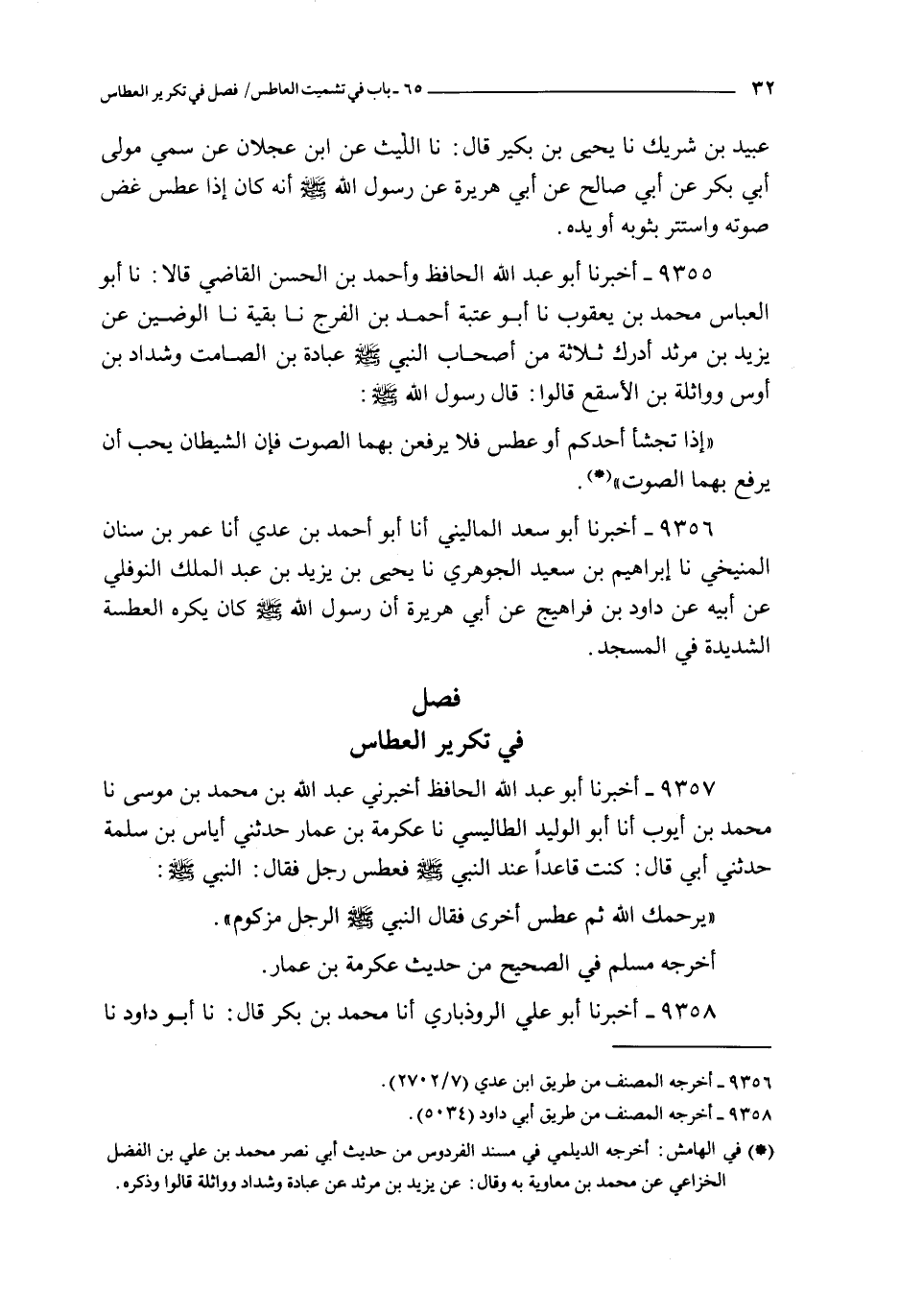 9358 - أخبرنا أبو علي الروذباري أنا محمد بن بكر قال : نا أبو داود نا مسدد نا يحيى عن ابن عجلان حدثني سعيد بن أبي سعيد عن أبي هريرة قال : شمت أخاك ثلاثا فما زاد هو زكام