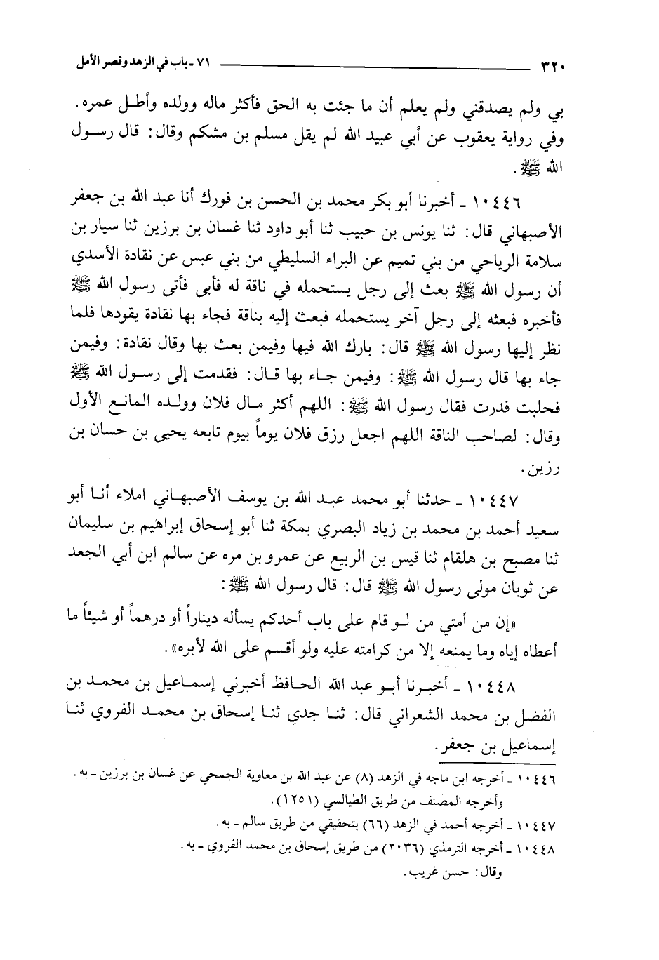 10446 - أخبرنا أبو بكر محمد بن سفورك أنا عبد الله بن جعفر الصبهاني قال : ثنا يونس بن حبيب ثنا أبو داود ثنا غسان بن برزين ثنا سيار بن سلامة الرياحي من بني تميم عن البراء السليطي من بني عبس عن نقادة الأسدي : أن رسول الله صلى الله عليه و سلم بعث إلى رجل يستحمله في ناقة له فأبى فأتى رسول الله صلى الله عليه و سلم فأخبره فبعثه إلى رجل آخر يستحمله فبعث إليه بناقة فجاء بها نقادة يقودها فلما نظر إليها رسول الله صلى الله عليه و سلم قال : بارك الله فيها و فيمن بعث بها و قال نقادة : و فيمن جاء بها قال رسول الله صلى الله عليه و سلم : و فيمن جاء بها قال : فقدمت إلى رسول الله صلى الله عليه و سلم فحلبت فدرت فقال رسول الله صلى الله عليه و سلم : اللهم أكثر مال فلان و ولده المانع الأول و قال : لصاحب الناقة اللهم اجعل رزق فلان يوما بيوم تابعه يحيى بن حسان بن رزين