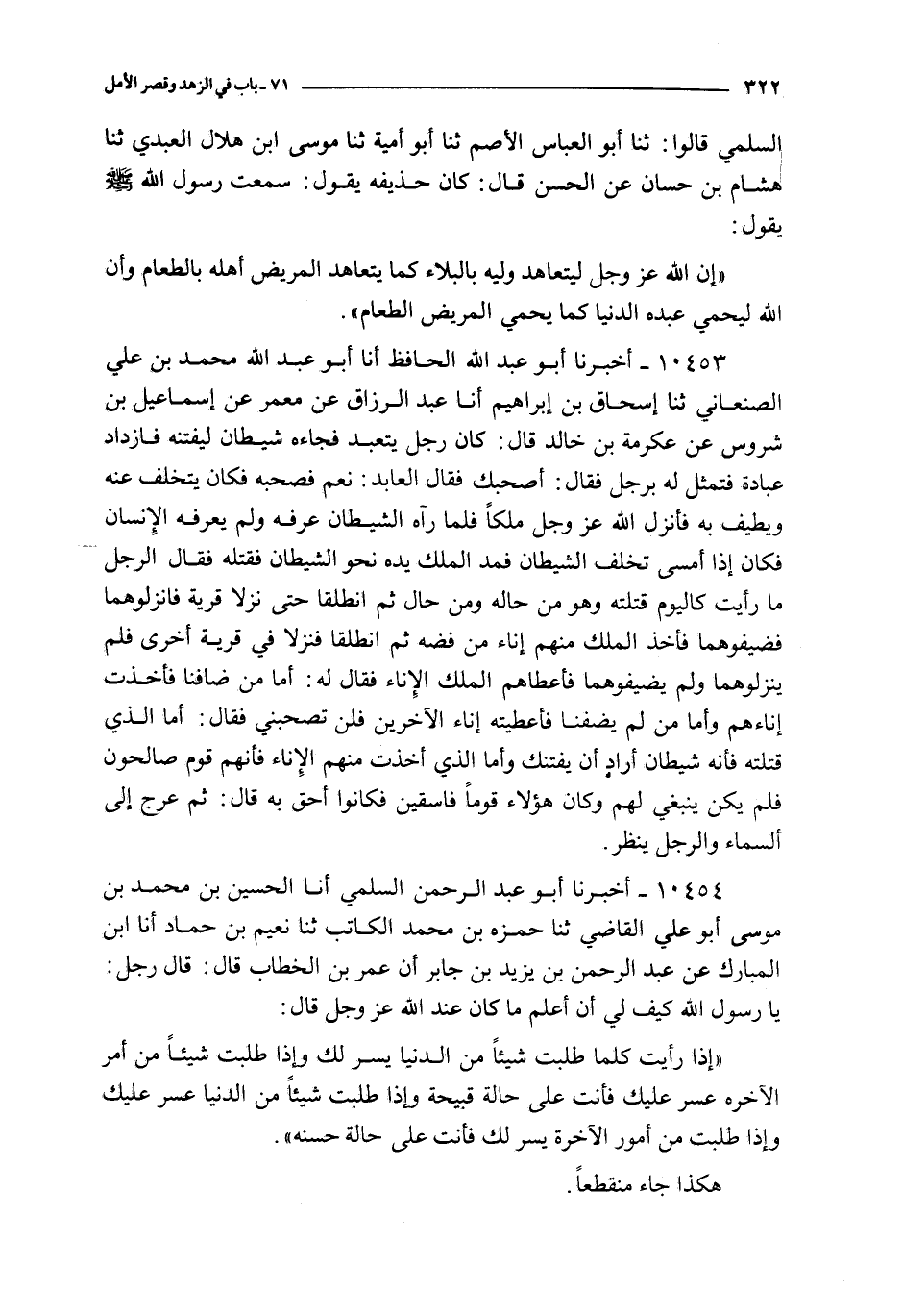10453 - أخبرنا أبو عبد الله الحافظ أنا أبو عبد الله محمد بن علي الصنعاني ثنا إسحاق بن إبراهيم أنا عبد الرزاق عن معمر عن إسماعيل بن شروس عن عكرمة بن خالد قال : كان رجل يتعبد فجاءه شيطان ليفتنه فازداد عبادة فتمثل له برجل فقال : أصحبك فقال العابد : نعم فصحبه فكان يتخلف عنه و يطيف به فأنزل الله عز و جل ملكا فلما رآه الشيطان عرفه و لم يعرفه الإنسان فكان إذا أمسى تخلف الشيطان فمد الملك يده نحو الشيطان فقتله فقال الرجل ما رأيت كاليوم قتلته و هو من حاله و من حال ثم انطلقا حتى نزلا قرية فأنزلوهما فضيفوهما فأخذ الملك منهم إناء من فضة ثم انطلقا فنزلا في قرية أخرى فلم ينزلوهما و لم يضيفوهما فأعطاهم الملك الإناء فقال له : أما من ضافنا فأخذت إناءهم و أما من لم يضفنا فأعطيته إناء الآخرين فلن تصحبني فقال : أما الذي قتلته فإنه شيطان أراد أن يفتنك و أما الذي أخذت منهم الإناء فإنهم قوم صالحون فلم يكن ينبغي لهم و كان هؤلاء قوما فاسقين فكانوا أحق به قال : ثم عرج إلى السماء و الرجل ينظر
