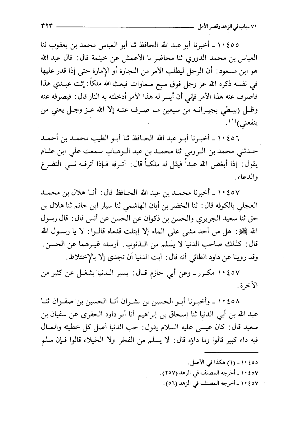 10455 - أخبرنا أبو عبد الله الحافظ ثنا أبو العباس محمد بن يعقوب ثنا العباس بن محمد الدوري ثنا محاضر ثنا الأعمش عن خيثمة قال : قال عبد الله هو ابن مسعود : أن الرجل ليطلب الأمر من التجارة أو الإمارة حتى إذا قدر عليها في نفسه ذكره الله عز و جل فوق سبع سماوات فبعث الله ملكا : ائت عبدي هذا فاصرف عنه هذا الأمر فإني أن أيسر له هذا الأمر أدخلته به النار قال : فيصرفه عنه و ظل يبطي بجيرانه من سبعين ما صرف عنه إلا الله عز و جل يعني من ينفعني