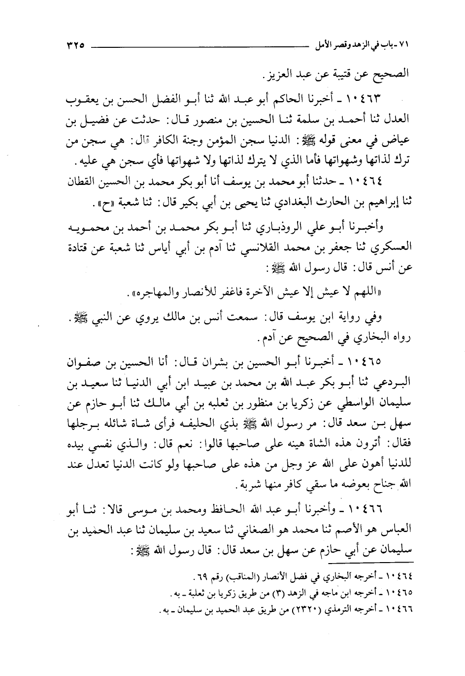10465 - أخبرنا أبو الحسين بن بشران قال : أنا الحسين بن صفوان البردعي ثنا أبو بكر عبد الله بن محمد بن عبيد بن أبي الدنيا ثنا سعيد بن سليمان الواسطي عن زكريا بن منظور بن ثعلبه بن أبي مالك ثنا أبو حازم عن سهل بن سعد قال : مر رسول الله صلى الله عليه و سلم بذي الحليفة فرأى شاة شائلة برجلها فقال : أترون هذه الشاة هينه على صاحبها قالوا : نعم قال : و الذي نفسي بيده للدنيا أهون على الله عز و جل من هذه على صاحبها و لو كانت الدنيا تعدل عند الله جناح بعوضة ما سقي كافر منها شربة