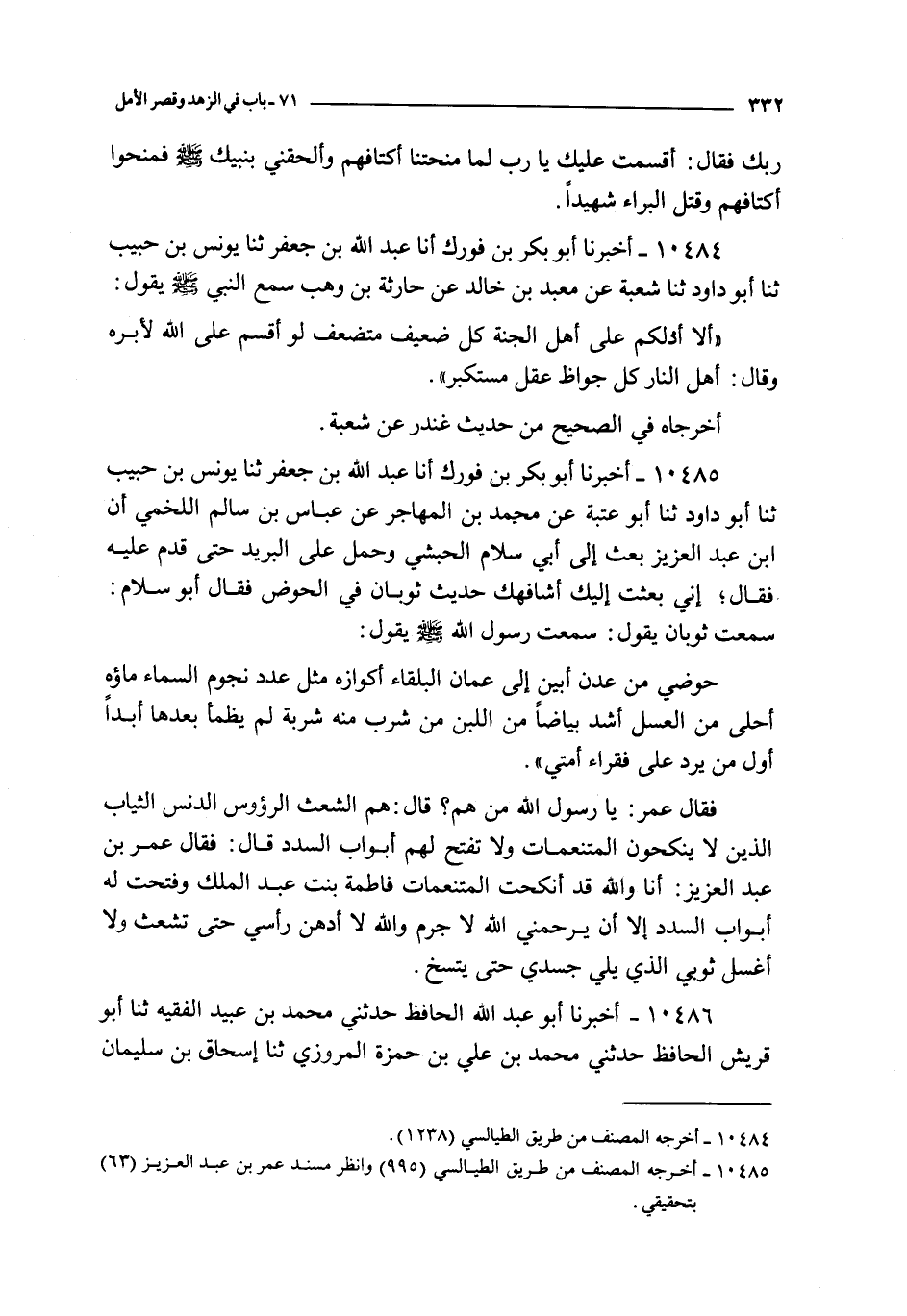 10485 - أخبرنا أبو بكر بن فورك أنا عبد الله بن جعفر ثنا يونس بن حبيب ثنا أبو داود ثنا أبو عتبة عن محمد بن المهاجر عن عباس بن سالم اللخمي أن ابن عبد العزيز بعث إلى أبي سلام الحبشي و حمل على البريد حتى قدم عليه فقال : إني بعثت إليك أشافهك حديث ثوبان في الحوض فقال أبو سلام : سمعت ثوبان يقول : سمعت رسول الله صلى الله عليه و سلم يقول : حوضي من عدن أبين إلى عمان البلقاء أكوازه مثل عدد نجوم السماء ماؤه أحلى من العسل أشد بياضا من اللبن من شرب منه لم يظمأ بعدها أبدا أول من يرد علي فقراء أمتي