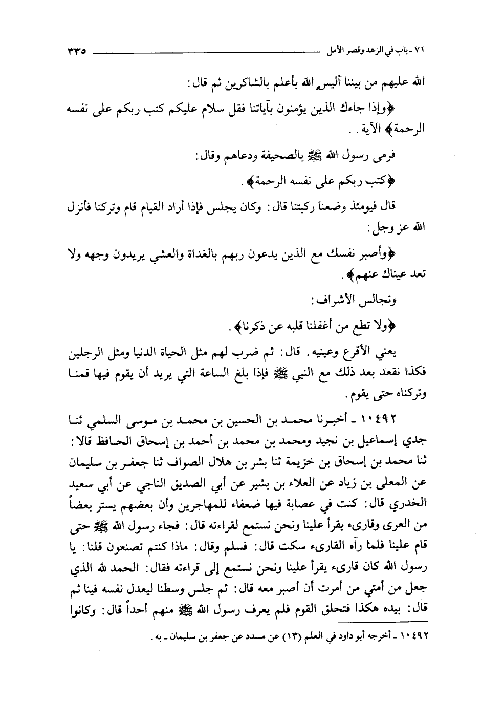 10492 - أخبرنا محمد بن الحسين بن محمد بن موسى السلمي ثنا جدي إسماعيل بن نجيد و محمد بن محمد بن أحمد بن إسحاق الحافظ قالا : ثنا محمد بن إسحاق بن خزيمة ثنا بشر بن هلال الصواف ثنا جعفر بن سليمان عن المعلى بن زياد عن العلاء بن بشير عن أبي الصديق الناجي عن أبي سعيد الخدري قال : كنت في عصابة فيها ضعفاء للمهاجرين و أن بعضهم يستر بعضا من العرى و قارىء يقرأ علينا و نحن نستمع لقراءته قال : فجاء رسول الله صلى الله عليه و سلم حتى قام علينا فلما رآه القارىء سكت قال : فسلم و قال : ماذا كنتم تصنعون قلنا : يا رسول الله كان قارىء يقرأ علينا و نحن نستمع إلى قراءته فقال : الحمد لله الذي جعل من أمتي من أمرت أن أصبر معه قال : ثم جلس وسطنا ليعدل نفسه فينا ثم قال : بيده هكذا فتحلق القوم فلم يعرف رسول الله صلى الله عليه و سلم منهم أحدا قال : و كانوا ضعفاء المهاجرين فقال النبي صلى الله عليه و سلم : أبشروا صعاليك المهاجرين بالفوز التام يوم القيامة تدخلون الجنة قبل أغنياء المؤمنين بنصف يوم مقداره خمسمائة عام