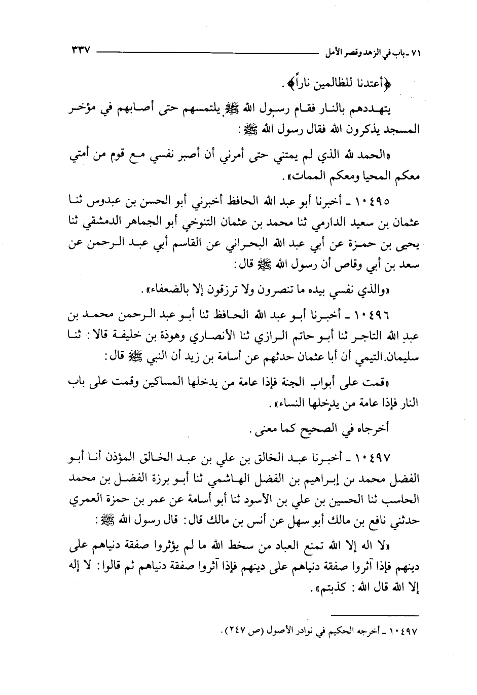 10496 - أخبرنا أبو عبد الله الحافظ ثنا أبو عبد الرحمن محمد بن عبد الله التاجر ثنا أبو حاتم الرازي ثنا الأنصاري و هوذة بن خليفة قالا : ثنا سليمان التيمي أن أبا عثمان حدثهم عن أسامة بن زيد : أن النبي صلى الله عليه و سلم قال : قمت على أبواب الجنة فإذا عامة من يدخلها المساكين و قمت على باب النار فإذا عامة من يدخلها النساء