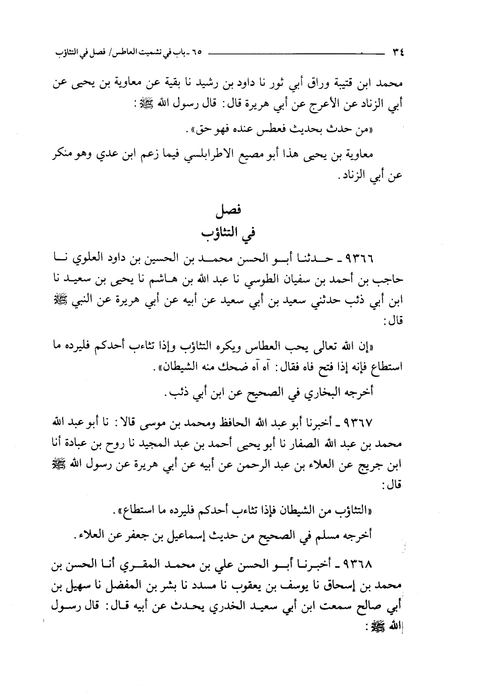 9367 - أخبرنا أبو عبد الله الحافظ و محمد بن موسى قالا : نا أبو عبد الله محمد بن عبد الله الصفار نا أبو يحيى أحمد بن عبد المجيد نا روح بن عبادة أنا ابن جريج عن العلاء بن عبد الرحمن عن أبيه عن أبي هريرة : عن رسول الله صلى الله عليه و سلم قال : التثاؤب من الشيطان فإذا تثاءب أحدكم فليرده ما استطاع