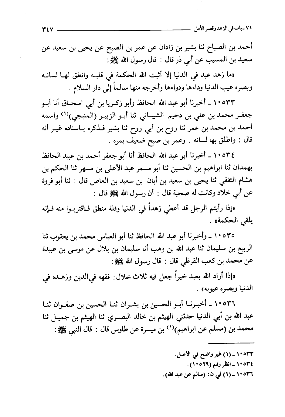 10536 - أخبرنا أبو الحسين بن بشران ثنا الحسين بن صفوان ثنا عبد الله بن أبي الدنيا حدثني الهيثم بن خالد البصري ثنا الهيثم بن جميل ثنا محمد بن مسلم عن إبراهيم بن مسرة عن طاوس قال : قال النبي صلى الله عليه و سلم :