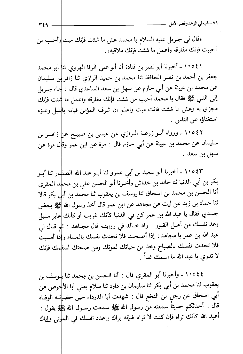 10543 - أخبرنا أبو سعيد بن أبي عمرو ثنا أبو عبد الله الصفار ثنا أبو بكر بن أبي الدنيا ثنا خالد بن خداش و أخبرنا أبو الحسن علي بن محمد المقري أنا الحسن بن محمد بن إسحاق ثنا يوسف بن يعقوب ثنا محمد بن أبي بكر قالا ثنا حماد بن زيد عن ليث عن مجاهد عن ابن عمر قال : أخذ رسول الله صلى الله عليه و سلم ببعض جسدي فقال يا عبد الله بن عمر كن في الدنيا كأنك غريب أو كأنك عابر سبيل و عد نفسك من أهل القبور زاد خالد في روايته قال مجاهد : ثم قال لي عبد الله بن عمر يا مجاهد : إذا أصبحت فلا تحدث نفسك بالمساء و إذا أمسيت فلا تحدث نفسك بالصباح و خذ من حياتك لموتك و من صحتك لسقمك فإنك لا تدري يا عبد الله ما اسمك غدا
