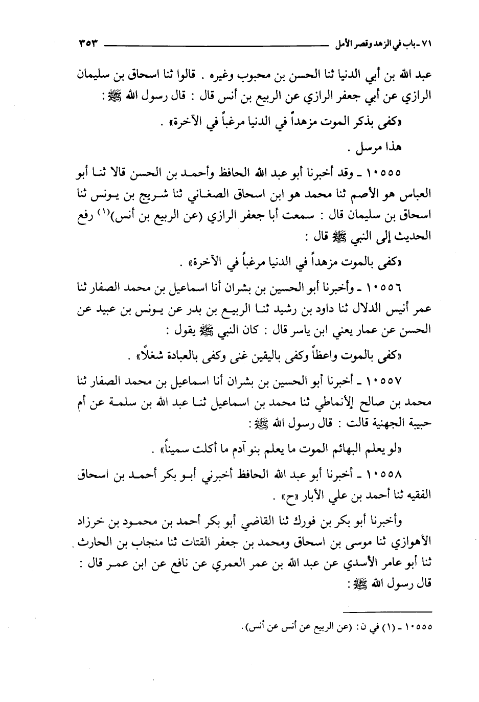10555 - و قد أخبرنا أبو عبد الله الحافظ و أحمد بن الحسن قالا ثنا أبو العباس هو الأصم ثنا محمد هو ابن إسحاق الصغاني ثنا شريح بن يونس ثنا إسحاق بن سليمان قال : سمعت أبا جعفر الرازي عن الربيع بن أنس : رفع الحديث إلى النبي صلى الله عليه و سلم قال : كفى بالموت مزهدا في الدنيا مرغبا في الآخرة