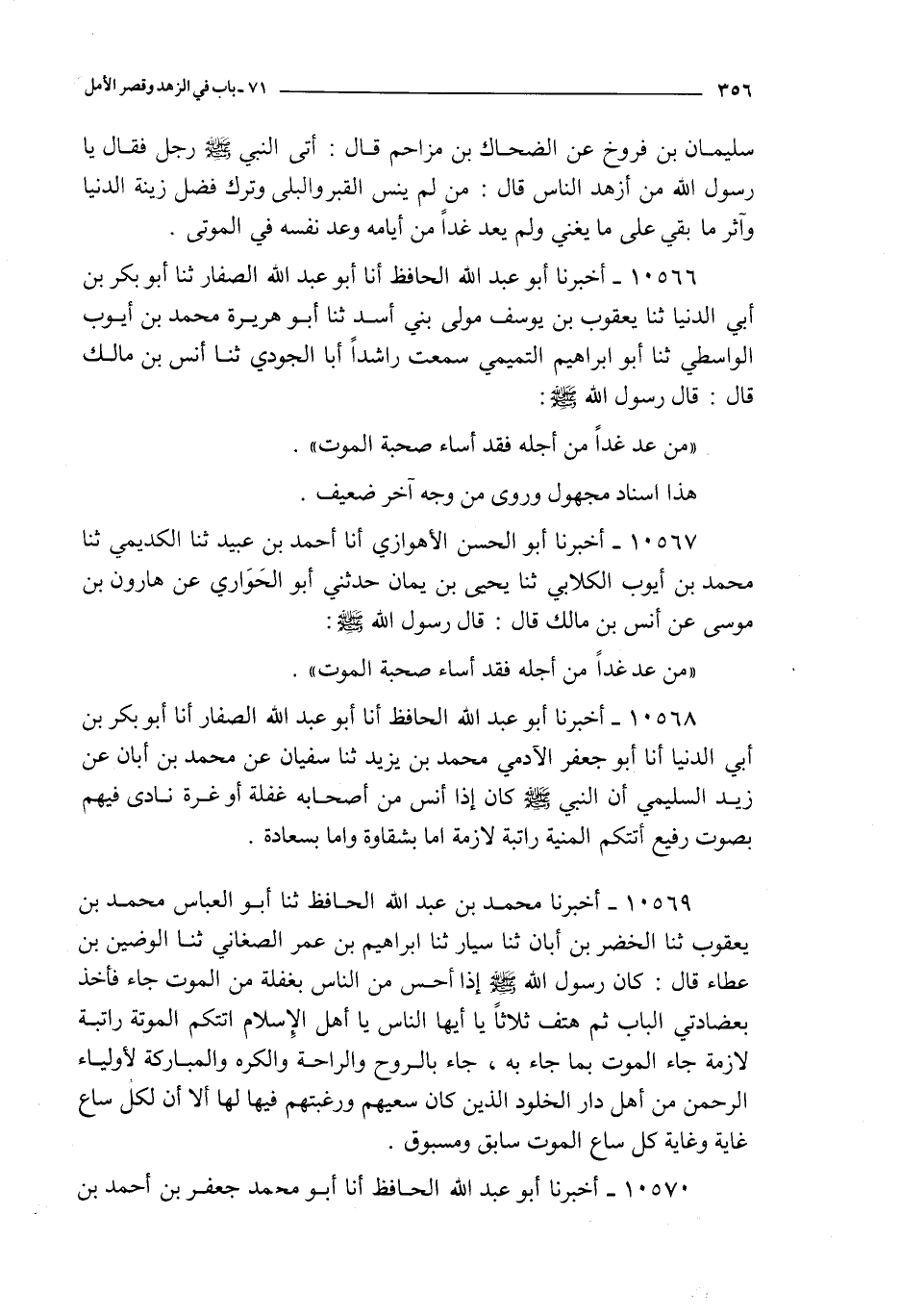 10568 - أخبرنا أبو عبد الله الحافظ أنا أبو عبد الله الصفار أنا أبو بكر بن أبي الدنيا أنا جعفر الآدمي محمد بن يزيد ثنا سفيان عن محمد بن أبان عن زيد السليمي : أن النبي صلى الله عليه و سلم كان إذا أنس من أصحابه غفلة أو غرة نادى فيهم بصوت رفيع أتتكم المنية راتبة لازمة إما بشقاوة و إما بسعادة