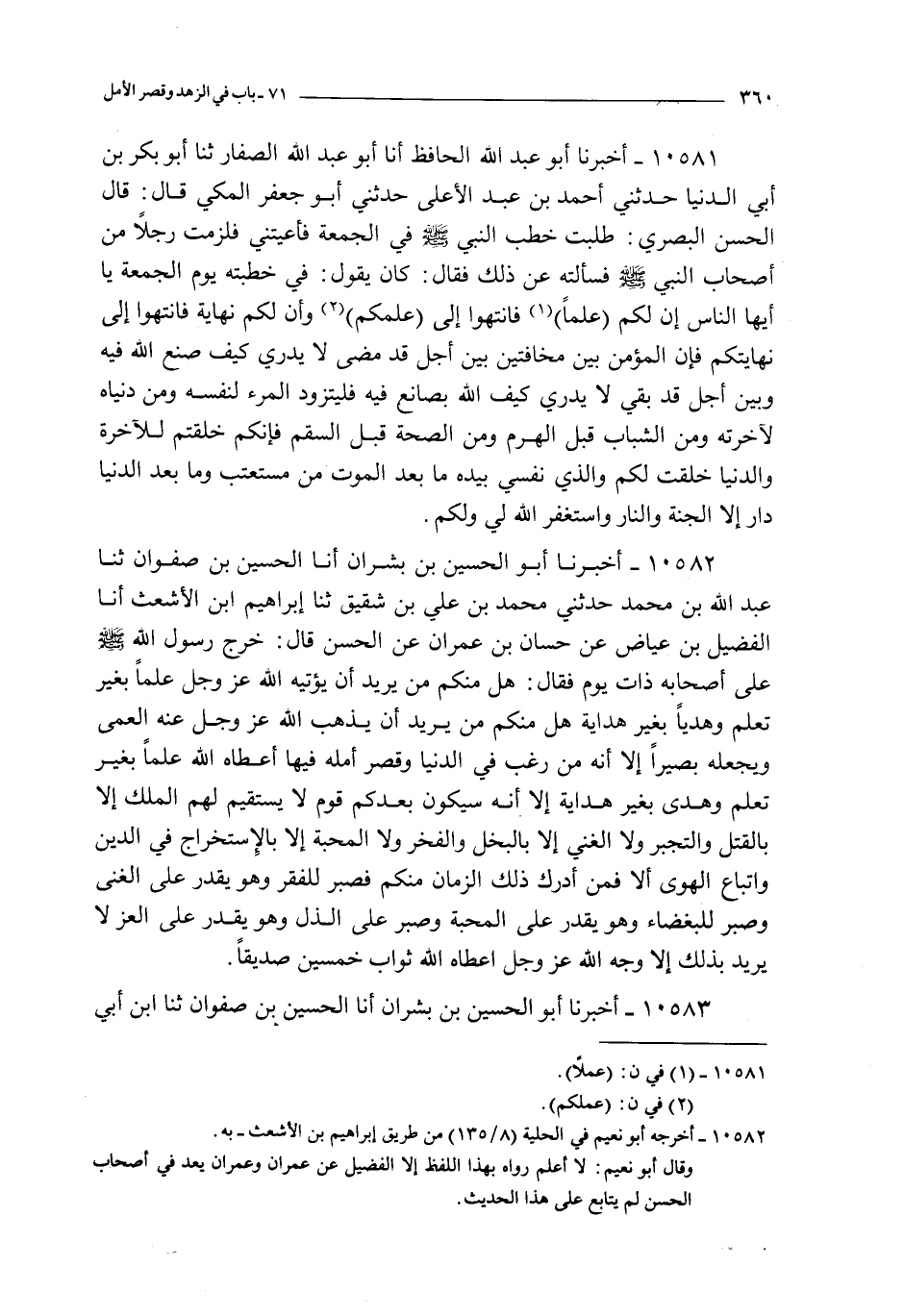 10581 - أخبرنا أبو عبد الله الحافظ أنا أبو عبد الله الصفار ثنا أبو بكر بن أبي الدنيا حدثني أحمد بن عبد العلى حدثني أبو جعفر المكي قال : قال الحسن البصري : طلبت خطب النبي صلى الله عليه و سلم في الجمعة فأعيتني فلزمت رجلا من أصحاب النبي صلى الله عليه و سلم فسألته عن ذلك فقال : كان يقول : في خطبته يوم الجمعة يا أيها الناس إن لكم علما فانتهوا إلى علمكم و إن لكم نهاية فانتهوا إلى نهايتكم فإن المؤمن بين مخافتين بين أجل قد مضى لا يدري كيف صنع الله فيه و بين أجل قد بقي لا يدري كيف الله بصانع فيه فليتزود المرء لنفسه و من دنياه لآخرته و من الشباب قبل الهرم و من الصحة قبل السقم فإنكم خلقتم للآخرة و الدنيا خلقت لكم و الذي نفسي بيده ما بعد الموت من مستعتب و ما بعد الدنيا دار إلا الجنة و النار و أستغفر الله لي و لكم