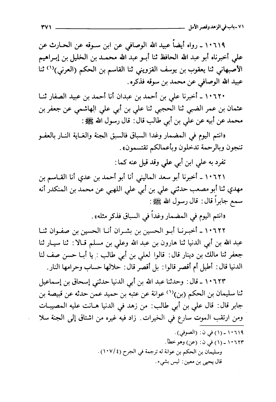 10622 - أخبرنا أبو الحسين بن بشران أنا الحسين بن صفوان ثنا عبد الله بن أبي الدنيا ثنا هارون بن عبد الله و علي بن مسلم قالا : ثنا سيار ثنا جعفر ثنا مالك بن دينار قال : قالوا لعلي بن أبي طالب : يا أبا حسن صف لنا الدنيا قال : أطيل أم أقصر قالوا : بل أقصر قال : حلالها حساب و حرامها النار