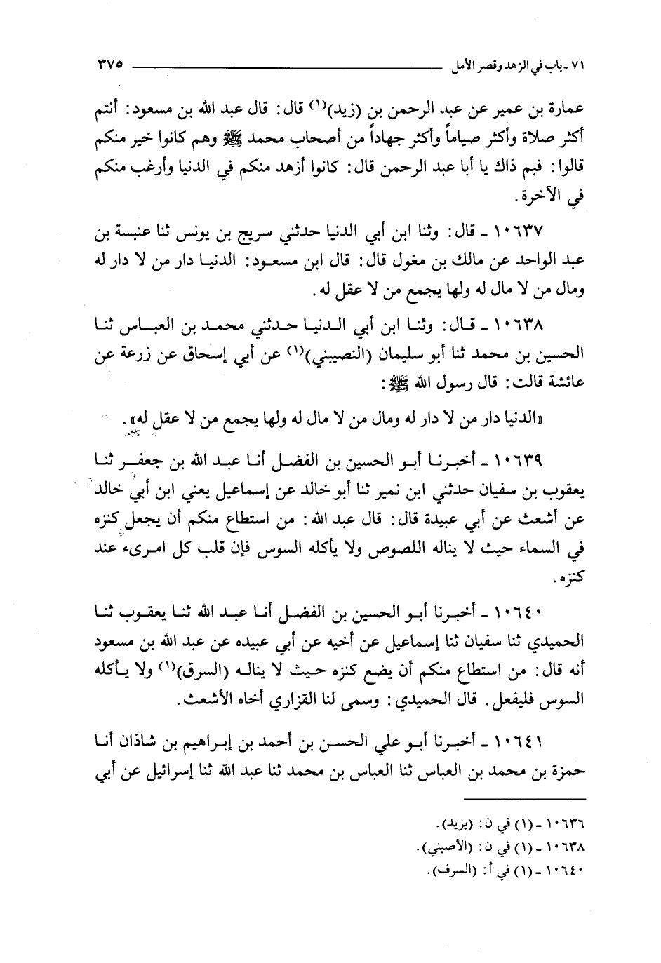 10637 - قال : و ثنا ابن أبي الدني حدثني سريج بن يونس ثنا عنبسة بن عبد الواحد عن مالك بن مغول قال : قال ابن مسعود : الدنيا دار من لا دار له و مال من لا مال له و لها يجمع من لا عقل له