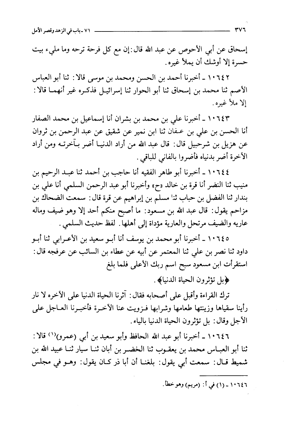 10643 - أخبرنا علي بن محمد بن بشران أنا إسماعيل بن محمد الصفار أنا الحسن بن علي بن عفان ثنا ابن نمير عن شقيق عن عبد الرحمن بن ثروان عن هزيل بن شرحبيل قال : قال عبد الله : من أراد أضر بآخرته و من اراد الآخرة أضر بدنياه فأضروا بالفاني للباقي