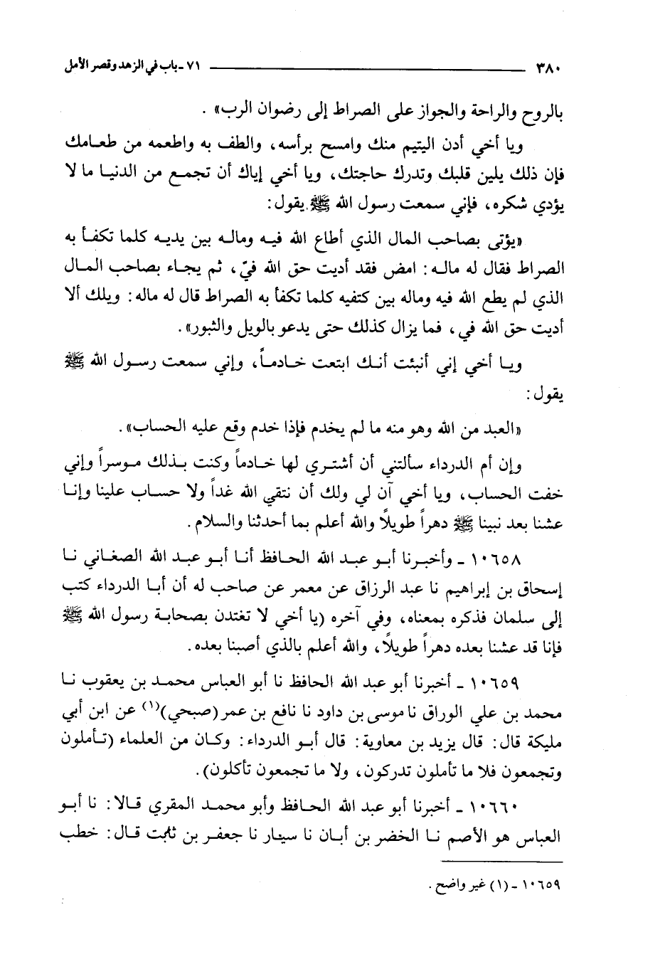 10659 - و أخبرنا أبو عبد الله الحافظ نا أبو العباس محمد بن يعقوب نا محمد بن علي الوراق نا موسى بن داود نا نافع بن عمر صبحي عن ابن أبي مليكة قال : قال يزيد بن معاوية : قال أبو الدرداء : و كان من العلماء تأملون و تجمعون فلا ما تأملون تدركون و لا ما تجمعون تأكلون