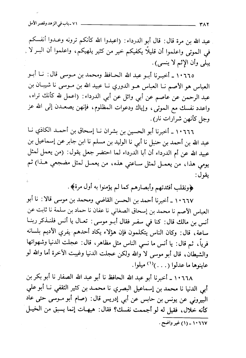 10667 - أخبرنا أحمد بن الحسن القاضي و محمد بن موسى قالا : نا أبو العباس الأصم نا محمد بن إسحاق الصغاني نا عفان نا حماد بن سلمة نا ثابت عن أنس بن مالك قال : كنا في سفر فقال أبو موسى : تعال يا أنس فلنذكر ربنا ساعة قال : و كان الناس يتكلمون فإن هؤلاء يكاد أحدهم يفري الأديم بلسانه فريا ثم قال : يا أنس ما نسي الناس مثل مظاهر قال : عجلت الدنيا و شهواتها و الشيطان قال أبو موسى لا و الله و لكن عجلت الدنيا و غيبت الآخرة أما و الله لو عاينوها ما عدلوا ( ) ميلوا