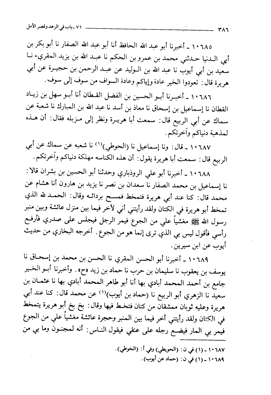 10689 - أخبرنا أبو الحسن المقري نا الحسن بن محمد بن إسحاق نا يوسف بن يعقوب نا سليمان بن حرب نا حماد بن زيد ح و أخبرنا أبو الخير جامع بن أحمد المحمد أبادي بها أنا أبو طاهر المحمد أباذي بها نا عثمان بن سعيد نا الزهري أبو الربيع نا حماد بن أيوب عن محمد قال : كنا عند أبي هريرة و عليه ثوبان ممشقان من كتان فتخط فيها و قال : بخ بخ أبو هريرة يتمخط في الكتان و لقد رأيتني أخر فيما بين المنبر و حجرة عائشة مغشيا علي من الجوع فيمر بي المار فيضع رجله على عنقي فيقول الناس : أنه لمجنون و ما بي من جنون إلا الجوع و في رواية سليمان إني لأخر بين منبر رسول الله صلى الله عليه و سلم إلى حجرة عائشة مغشيا علي فيضع رجله على عنقي و يرى أن بي جنون ما بي من جنون إلا الجوع