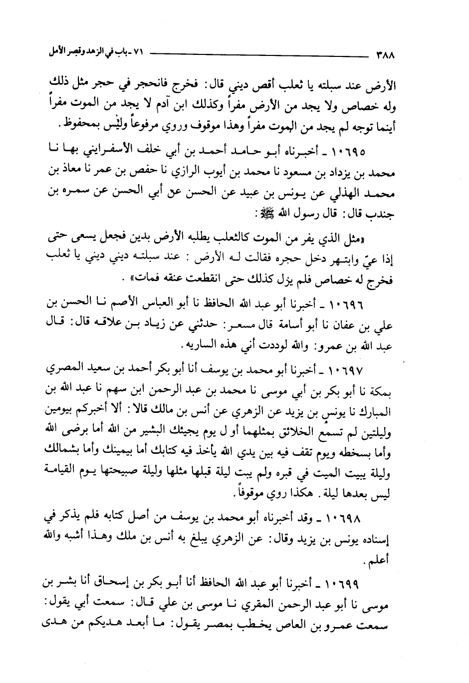 10695 - أخبرناه أبو حامد أحمد بن أبي خلف الأسفرايني بها نا محمد بن يزداد بن مسعود نا محمد بن أيوب الرازي نا حفص بن عمر نا معاذ بن محمد الهذلي عن يونس بن عبيد عن الحسن عن أبي الحسن عن سمرة بن جندب قال : قال رسول الله صلى الله عليه و سلم : مثل الذي يفر من الموت كالثعلب يطلبه الأرض بدين فجعل يسعى حتى إذا عي و ابتهر دخل حجره فقالت له الأرض : عند سبلته ديني ديني يا ثعلب فخرج له خصاص فلم يزل كذلك حتى انقطعت عنقه فمات