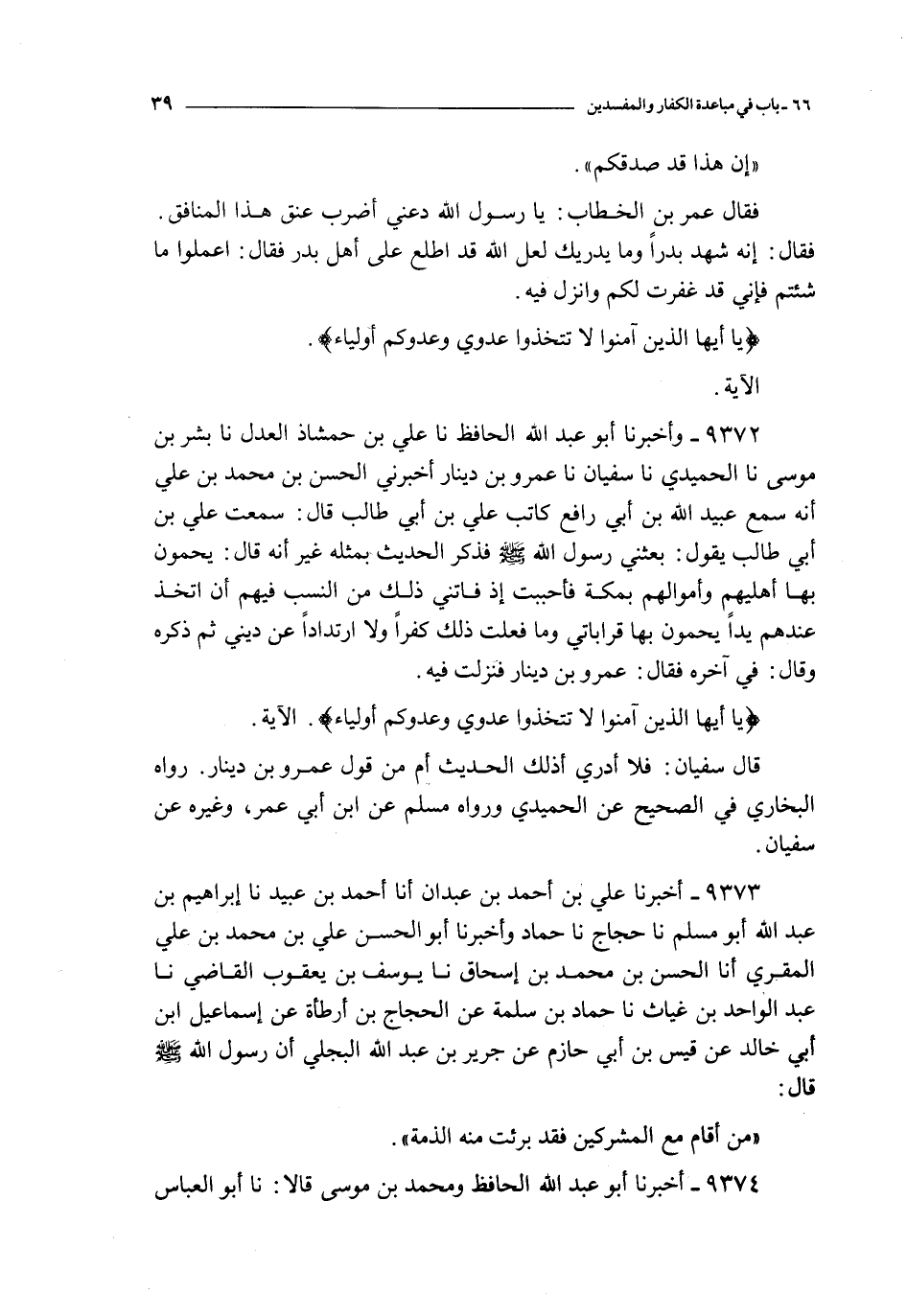 9373 - أخبرنا علي بن أحمد بن عبدان أنا أحمد بن عبيد نا إبراهيم بن عبد الله أبو مسلم نا حجاج نا حماد و أخبرنا أبو الحسن علي بن محمد بن علي المقري أنا الحسن بن محمد بن إسحاق نا يوسف بن يعقوب القاضي نا عبد الواحد بن غياث نا حماد بن سلمة عن الحجاج بن أرطأة عن إسماعيل ابن أبي خالد عن قيس بن أبي حازم عن جرير بن عبد الله البجلي : أن رسول الله صلى الله عليه و سلم قال : من أقام مع المشركين فقد برئت منه الذمة