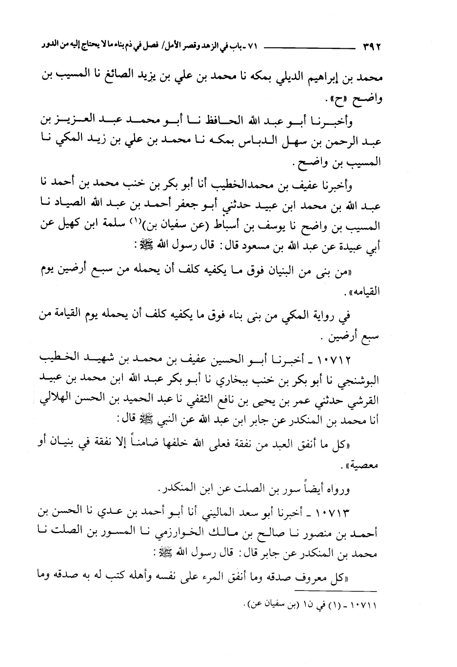 10712 - أخبرنا أبو الحسين عفيف بن محمد بن شهيد الخطيب البوشنجي نا أبو بكر بن خنب ببخارى نا أبو بكر عبد الله بن محمد بن عبيد القرشي حدثني عمر بن يحيى بن نافع الثقفي نا عبد الحميد بن الحسن الهلالي أنا محمد بن المنكدر عن جابر بن عبد الله : عن النبي صلى الله عليه و سلم قال : كل ما أنفق العبد من نفقة فعلى الله خلفها ضامنا إلا نفقة في بنيان أو معصية