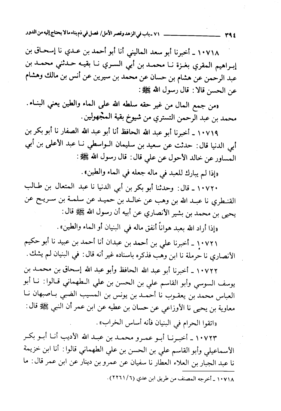 10721 - أخبرنا علي بن أحمد بن عبدان أنا أحمد بن عبيد نا أبو حكيم الأنصاري نا حرملة نا ابن وهب : فذكره بإسناده غير أنه قال : في البنيان لم يشك