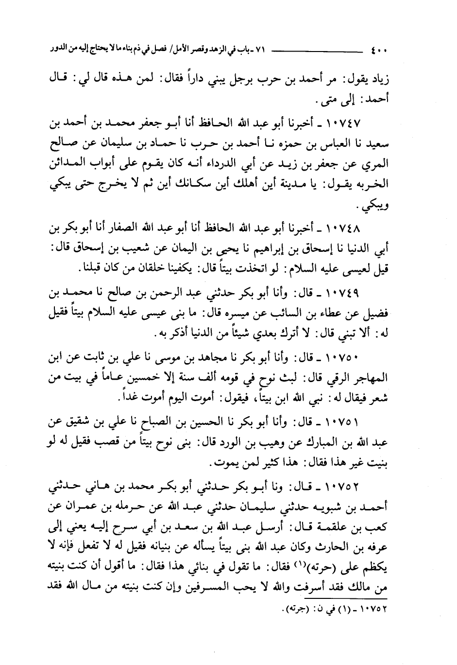 10751 - قال : و أنا أبو بكر نا الحسين بن الصباح نا علي بن شقيق عن عبد الله بن المبارك عن وهيب بن الورد قال : بنى نوح بيتا من قصب فقيل له لو بنيت غير هذا فقال : هذا كثير لمن يموت