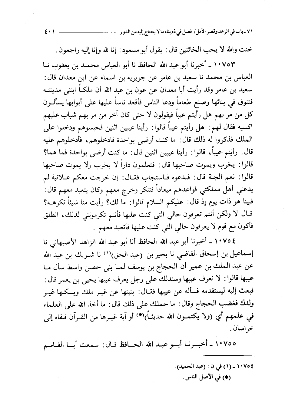 10753 - أخبرنا أبو عبد الله الحافظ نا أبو العباس محمد بن يعقوب نا العباس بن محمد نا سعيد بن عامر عن جويريه بن أسماء عن ابن معدان قال : سعيد بن عامر و قد رأيت أبا معدان عن عون بن عبد الله : أن ملكا ابتنى مدينته فتنوق في بنائها و صنع طعاما و دعا الناس فأقعد ناسا عليها على أبوابها يسألون كل من مر بهم هل رأيتم عيبا قالوا : رأينا عيبين اثنين فحبسوهم و دخلوا على الملك فذكروا له ذلك قال : ما كنت أرضى بواحدة فادخلوها فأدخلوهم عليه قال : رأيتم عيبا قالوا : رأينا عيبين اثنين قال : ما كنت أرضى بواحدة فما هما ؟ قالوا : يخرب و يموت صاحبها قال : فتعلمون دارا لا يخرب و لا يموت صاحبها قالوا : نعم الجنة قال : فدعوه فاستجاب فقال : إن خرجت معكم علانية لم يدعني أهل مملكتي فواعدهم ميعادا فتنكر و خرج معهم و كان يتعبد معهم قال : فبينا هو ذات يوم إذ قال : عليكم السلام قالوا : ما لك ؟ رأيت منا شيئا تكرهه ؟ قال لا و لكن أنتم تعرفون حالي التي كنت عليها فانتم تكرمونني لذلك انطلق فأكون مع قوم لا يعرفون حالي التي كنت عليها فأتعبد معهم