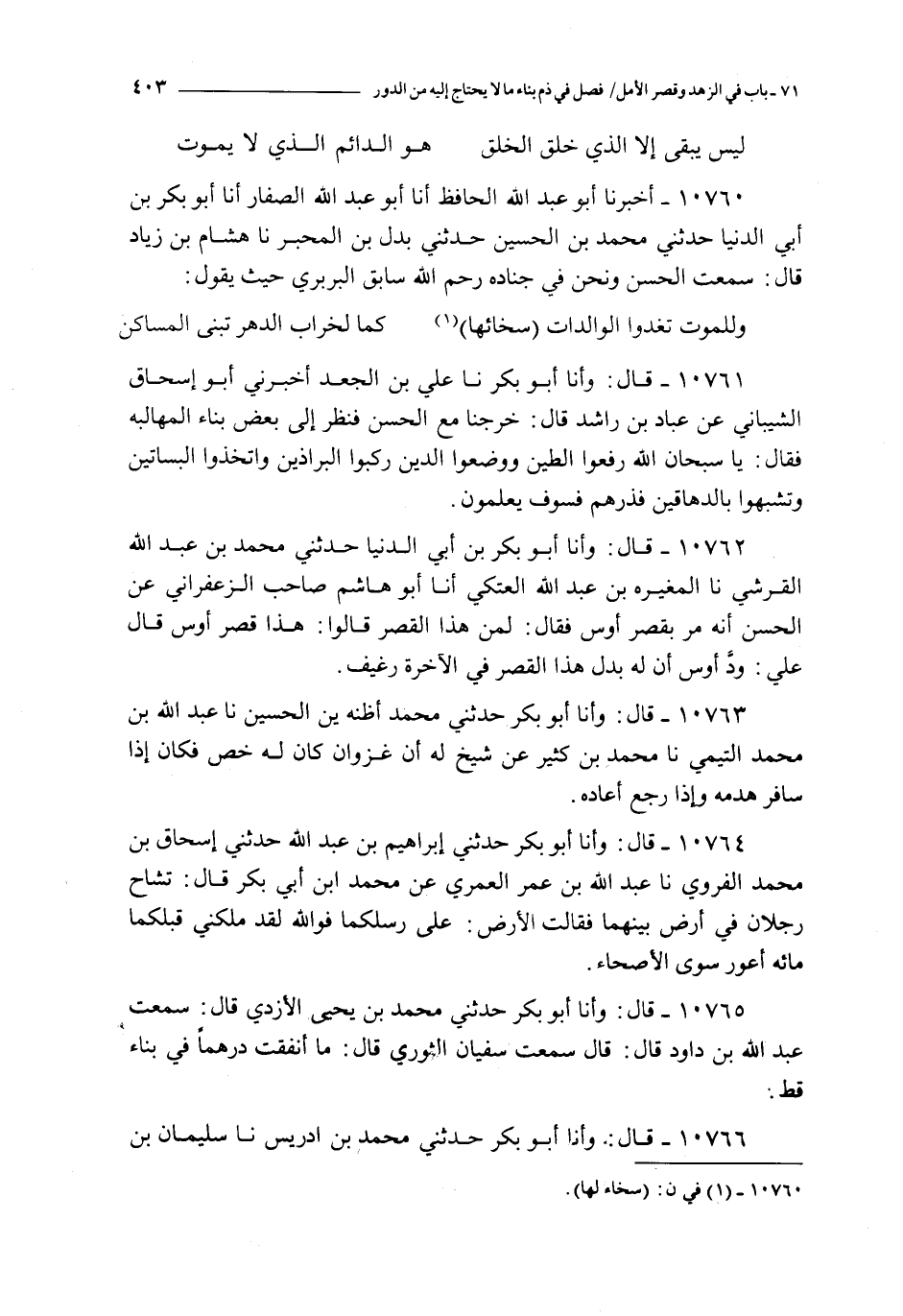 10762 - قال : و أنا أبو بكر بن أبي الدنيا حدثني محمد بن عبد الله القرشي نا المغيره بن عبد الله العتكي أنا أبو هاشم صاحب الزعفراني عن الحسن : أنه مر بقصر أوس فقال : لمن هذا القصر قالوا : هذا قصر أوس قال علي : ود أوس أن له بدل هذا القصر في الآخرة رغيف