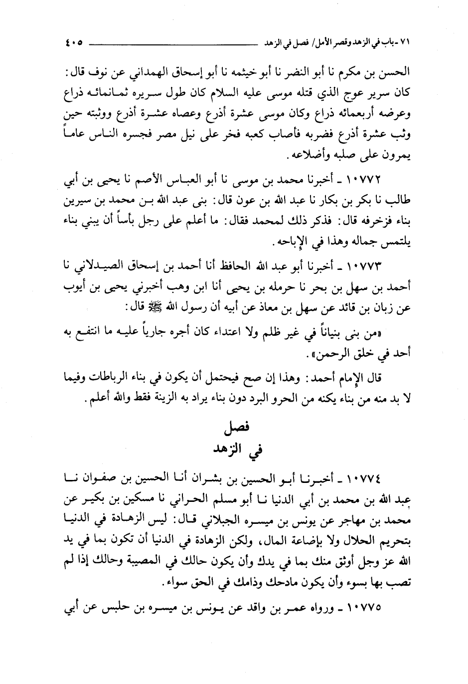 قال الإمام أحمد : و هذا إن صح فيحتمل أن يكون في بناء الرباطات و فيما لا بد منه من بناء يكنه من الحر و البرد دون بناء يراد به الزينة فقط و الله أعلم