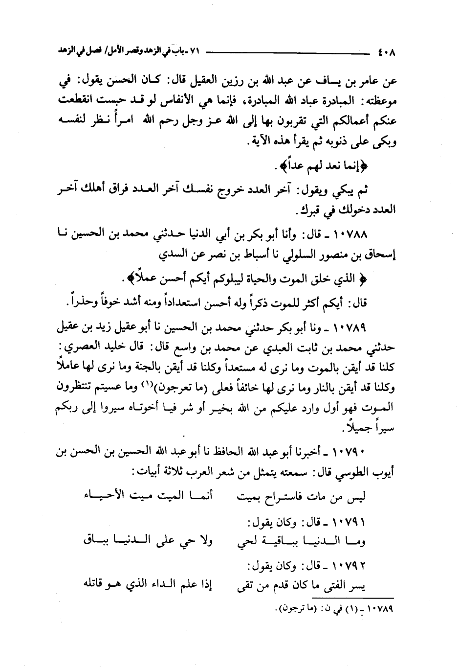 10789 - و نا أبو بكر حدثني محمد بن الحسين نا أبو عقيل زيد بن عقيل حدثني محمد بن ثابت العبدي عن محمد بن واسع قال : قال خليد العصري : كلنا قد أيقن بالموت و ما نرى له مستعدا و كلنا قد أيقن بالجنة و ما نرى لها عاملا و كلنا قد أيقن بالنار و ما نرى لها خائفا فعلى ما تعرجون و ما عسيتم تنتظرون الموت فهو أول وارد عليكم من الله بخير أو شر فيا أخوتاه سيروا إلى ربكم سيرا جميلا