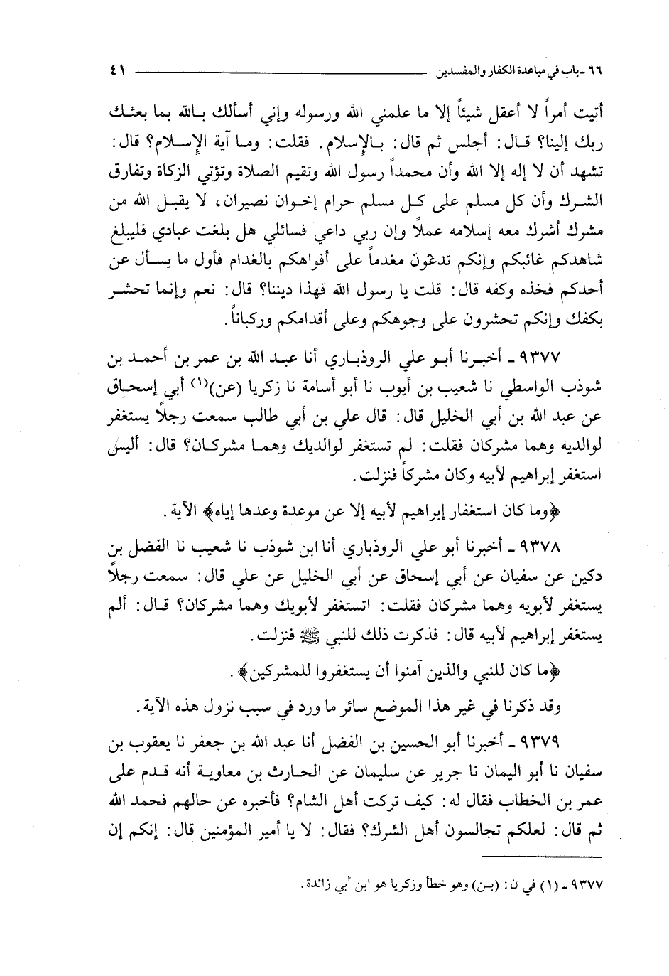 9377 - أخبرنا أبو علي الروذباري أنا عبد الله بن عمر بن أحمد بن شوذب الواسطي نا شعيب بن أيوب نا أبو أسامة نا زكريا عن أبي إسحاق عن عبد الله بن أبي الخليل قال : قال علي بن أبي طالب سمعت رجلا يستغفر لوالديه و هما مشركان فقلت : لم تستغفر لوالديك و هما مشركان ؟ قال : أليس استغفر إبراهيم لأبيه و كان مشركا فنزلت