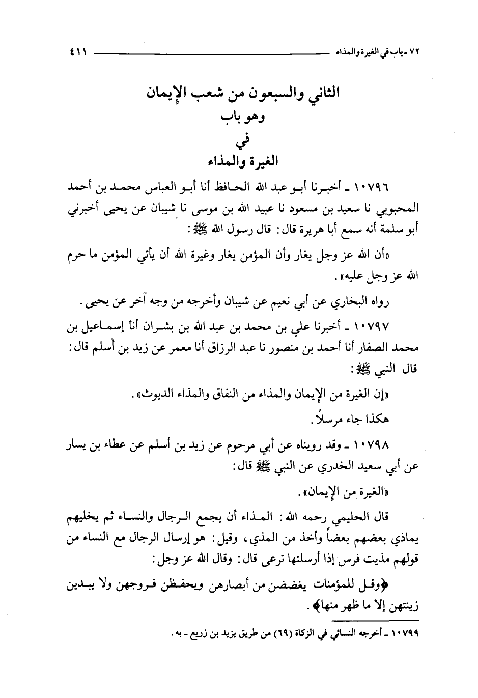 الثاني و السبعون من شعب الإيمان و هو باب في الغيرة و المذاء