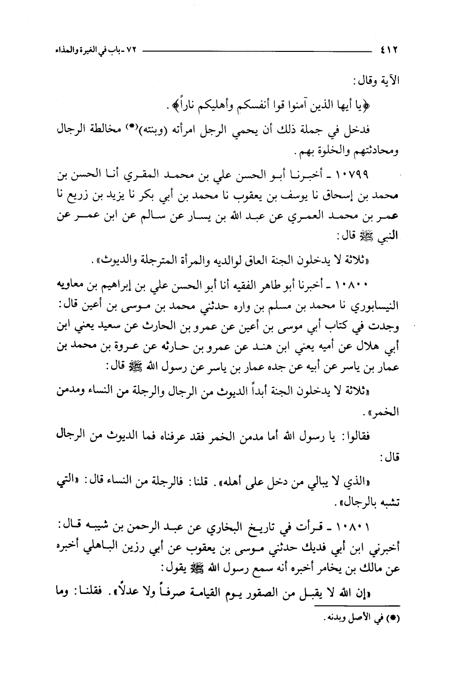 10800 - أخبرنا أبو طاهر الفقيه أنا أبو الحسن علي بن إبراهيم بن معاوية النيسابوري نا محمد بن مسلم بن واره حدثني محمد بن موسى بن أعين قال : وجدت في كتاب أبي موسى بن أعين عن عمرو بن الحارث عن سعيد يعني ابن أبي هلال عن أمية يعني ابن هند عن عمرو بن حارثه عن عروة بن محمد بن عمار بن ياسر عن أبيه عن جده عمار بن ياسر : عن رسول الله صلى الله عليه و سلم قال : ثلاثة لا يدخلون الجنة أبدا الديوث من الرجال و الرجلة من النساء و مدمن الخمر فقالوا : يا رسول الله أما مدمن الخمر فقد عرفناه فما الديوث من الرجال قال : الذي لا يبالي من دخل على أهله قلنا : فالرجلة من النساء قال : التي تشبه الرجال