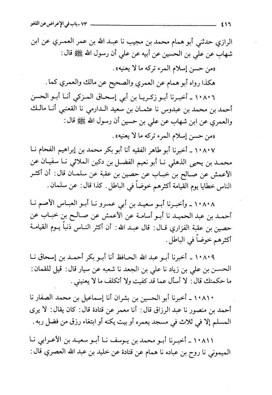 10806 - أخبرنا أبو زكريا بن أبي إسحاق المزكي أنا أبو الحسن أحمد بن محمد بن عبدوس نا عثمان بن سعيد الدارمي نا القعنبي أنا مالك و العمري عن ابن شهاب عن علي بن حسين : أن رسول الله صلى الله عليه و سلم قال : من حسن إسلام المرء تركه ما لا يعنيه